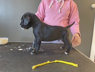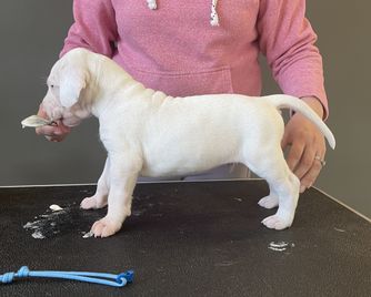 “The puppy price includes the health guarantee, AKC limited registration, vaccinations, deworming, microchip, dew claws removed, lots of puppy socialization. Ear Crop is available for additional fee. Deposit is refundable and will hold a particular puppy up to 8 weeks of age.”