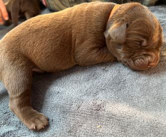 Rinnie is very intelligent, affectionate, and loyal. She is a lovely American retriever that loves to be active on land and water, but is also wonderfully calm in the house with her people. She loves to follow us around the home and property wherever we go, and is always up for a good game of fetch or kickball. She is also very happy to lay at our feet in the house and get her share of belly rubs. She has a beautiful soft red coat, and has white bolo marks on three paws, a white mark on her chest, and one white toe. We have seen these bolo marks passed down from one of our sires to puppies in previous litters. These marks descend back to the origins of the breed in Great Britain.