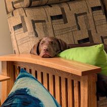 Jersey is 90+ pounds with a medium stocky build. She has a lovely light chocolate coat with incredibly soft, thick fur. She is very sweet, calm and affectionate, learns quickly, and is everybody’s instant friend ~ even the cats! She really loves pets, cuddles and the kids, and makes the BEST fluffy foot warmer during family movie nights!