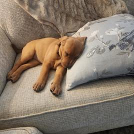 She has a very sweet, calm temperament, is very intelligent, and learns quickly. She absolutely loves children, people, pets and cuddles. She also loves a good run in the woods, a game of fetch, and retrieving on our pond. She loves to be with us and get involved with whatever we are doing. She is also calm and easy-going and able to chill out on her own when she’s not the center of attention (as she very much deserves to be!).