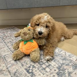 Maddie is a 13-pound Red Mini Poodle with champion bloodlines. She has a sweet, affectionate temperament and a playful personality, making her an excellent companion and mother. Her intelligence and gentle nature are hallmarks of the breed, and she passes these traits on to her puppies.