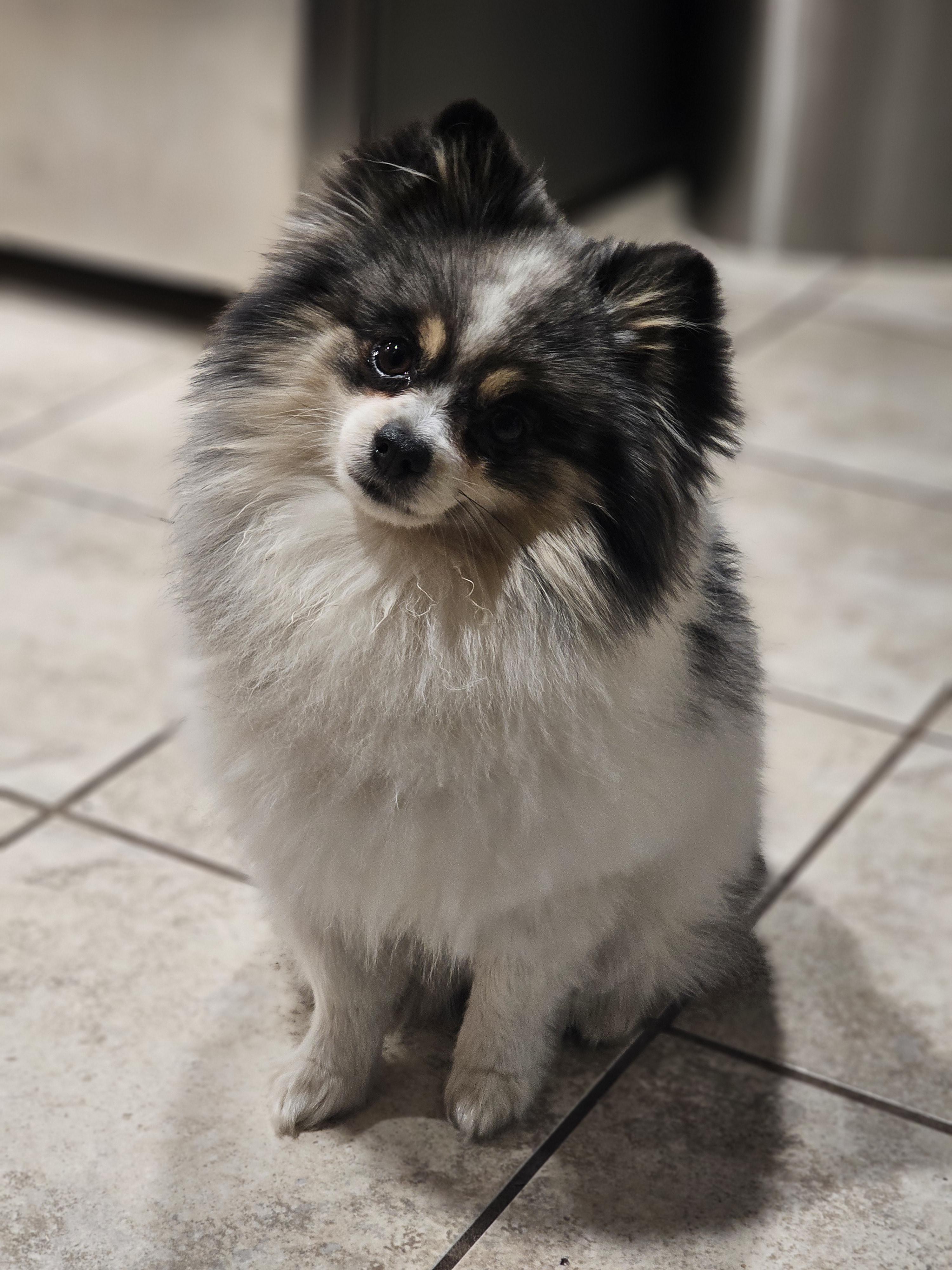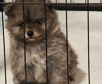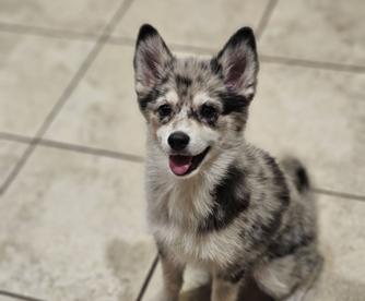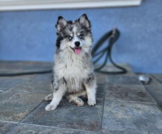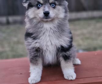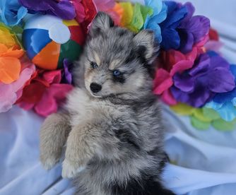 Our Pomeranian puppies are blue merle. Pomsky puppies are merle. Colors will vary depending on the parent dogs.
