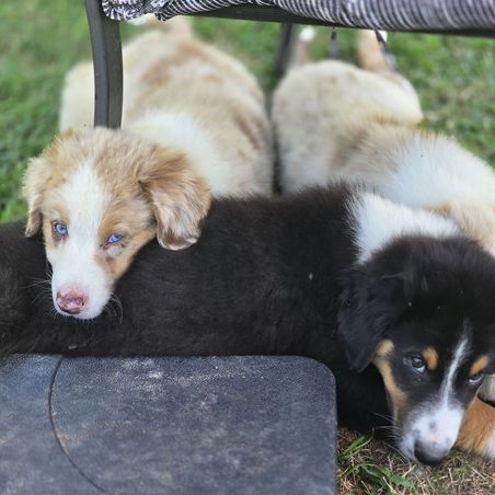 Our puppies include black, red merle, blue merle, and red. Colors will vary depending on the parent dogs.