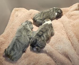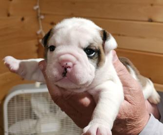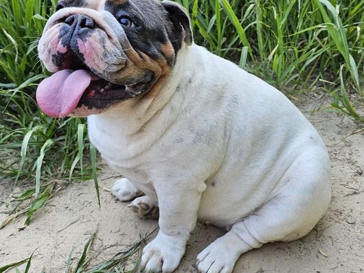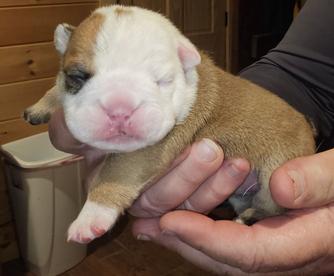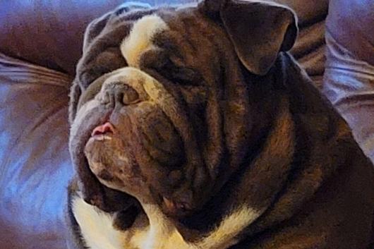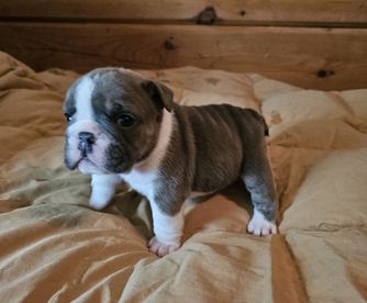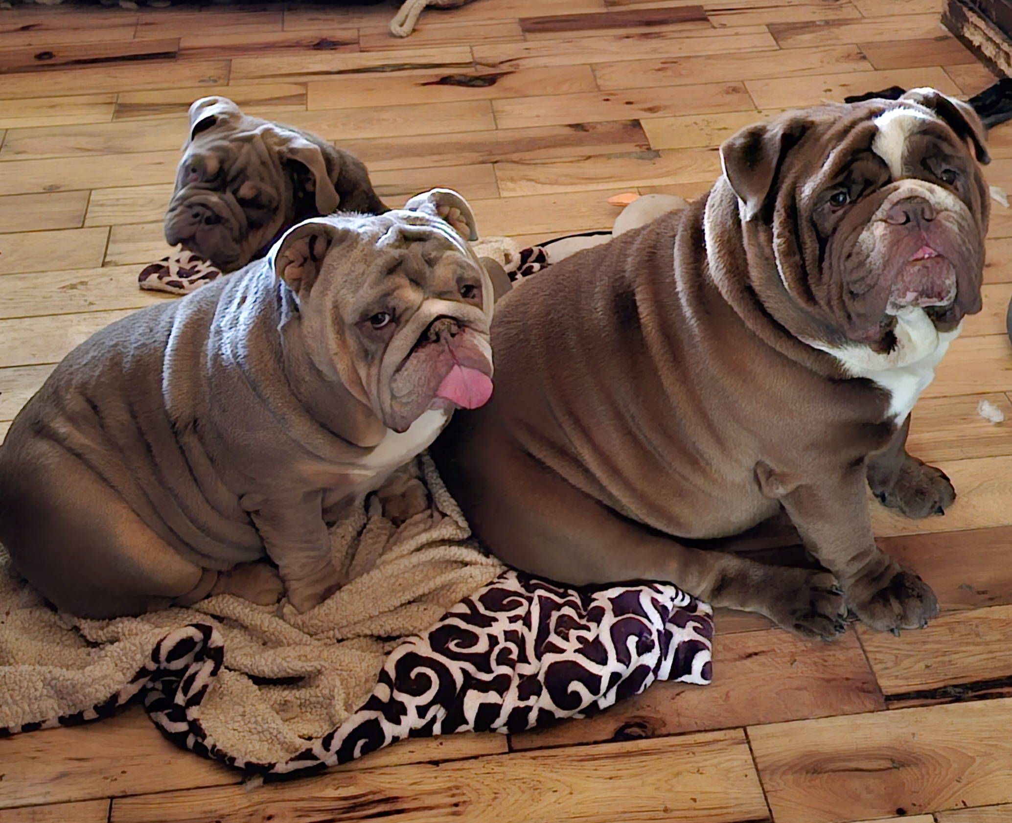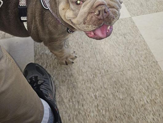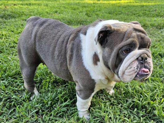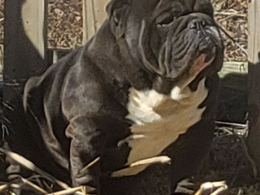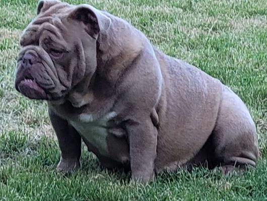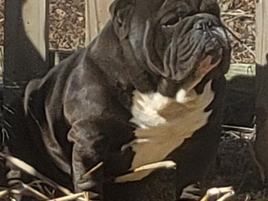 Blue is a short and stocky English Bulldog. He carries blue, chocolate and black. He is laid back and funny. Good airway, skin and tail