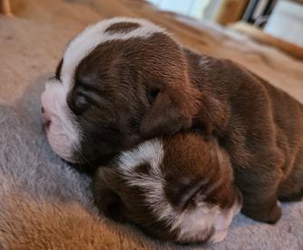 Peanut is a handsome Chocolate and white who carries black, blue and chocolate. Big, short and handsome.