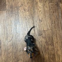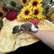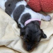 Lilliana is a precious little 4 week old black and tan ,long haired Dapple Piebald . She cuddly AND cute 🥰. Waiting for her parents to find her.🩷