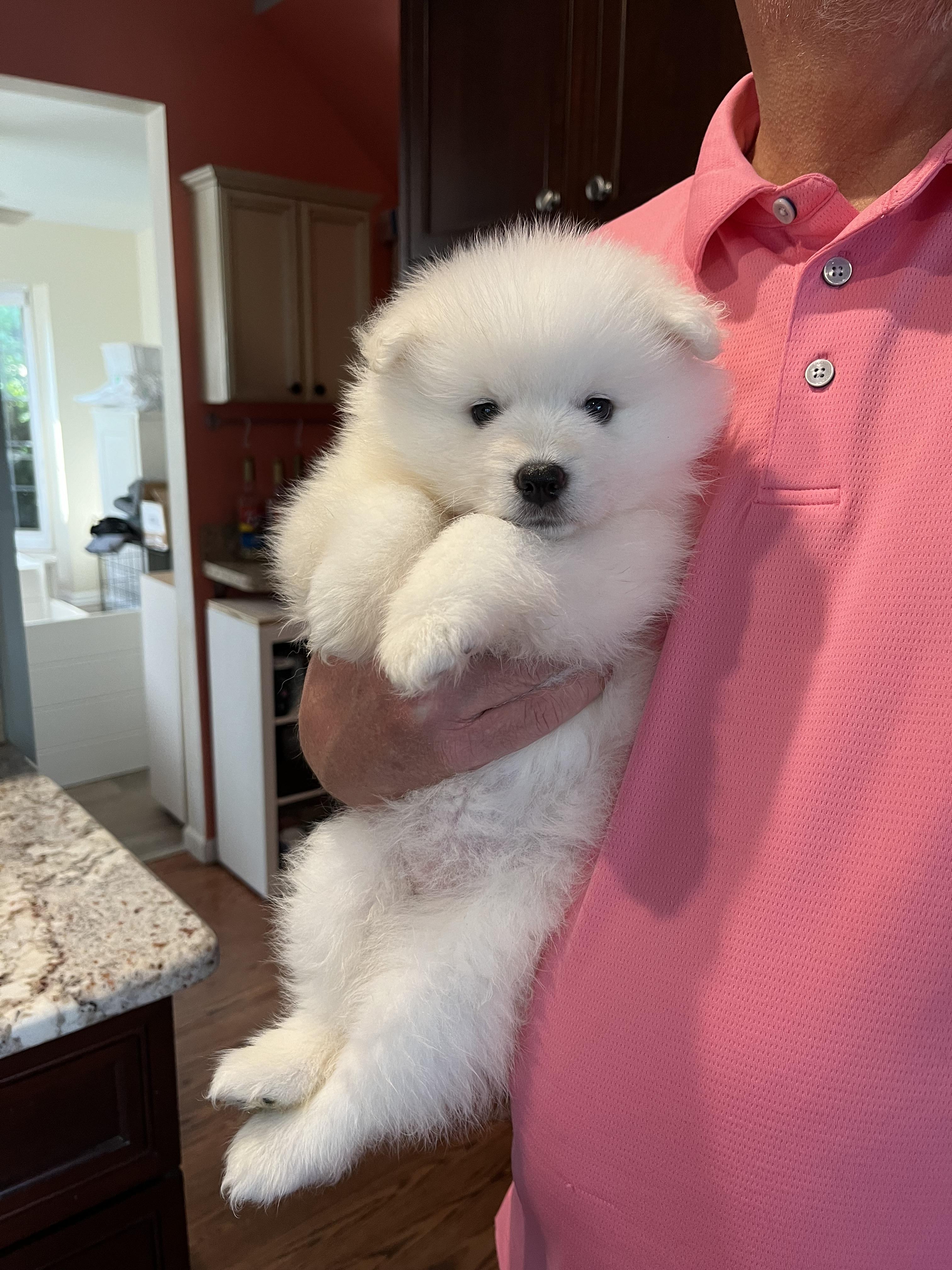 Dam is a female American Eskimo Dog. Carefully selected as a great representative of her breed, Debi decided to make her part of their program. Debi has passed Good Dog’s screening process, which involved a review of their breeding practices, environment, and the mental and physical health of their dogs.