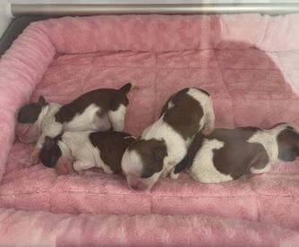 Our puppies include red and white and gold and white. Colors will vary depending on the parent dogs.