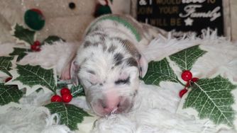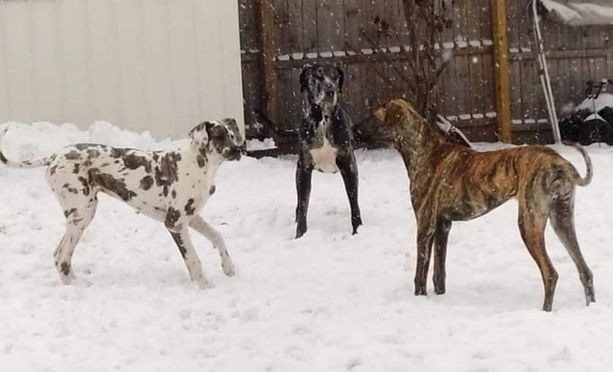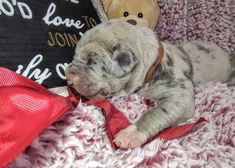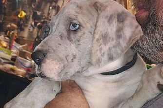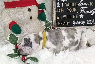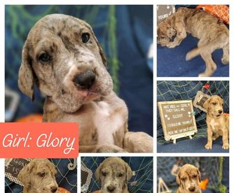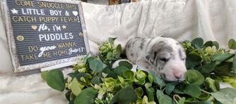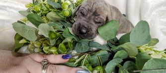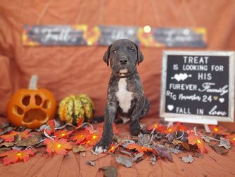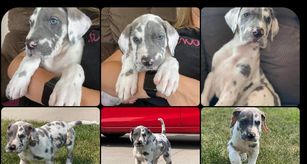 Our puppies include blue and white, merlequin, blue brindle, brindle, fawn, blue, harlequin, and merle. Colors will vary depending on the parent dogs.