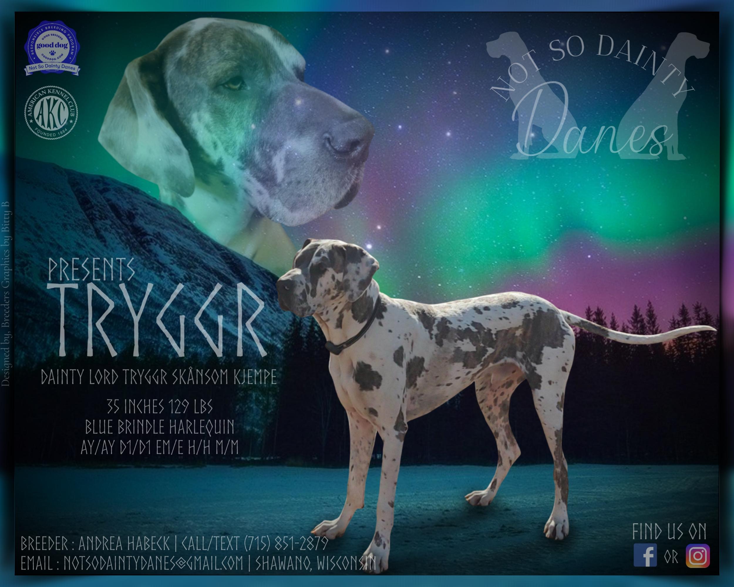 TryggR is a male Great Dane. Carefully selected as a great representative of his breed, Andrea decided to make him part of their program. Andrea has passed Good Dog’s screening process, which involved a review of their breeding practices, environment, and the mental and physical health of their dogs.