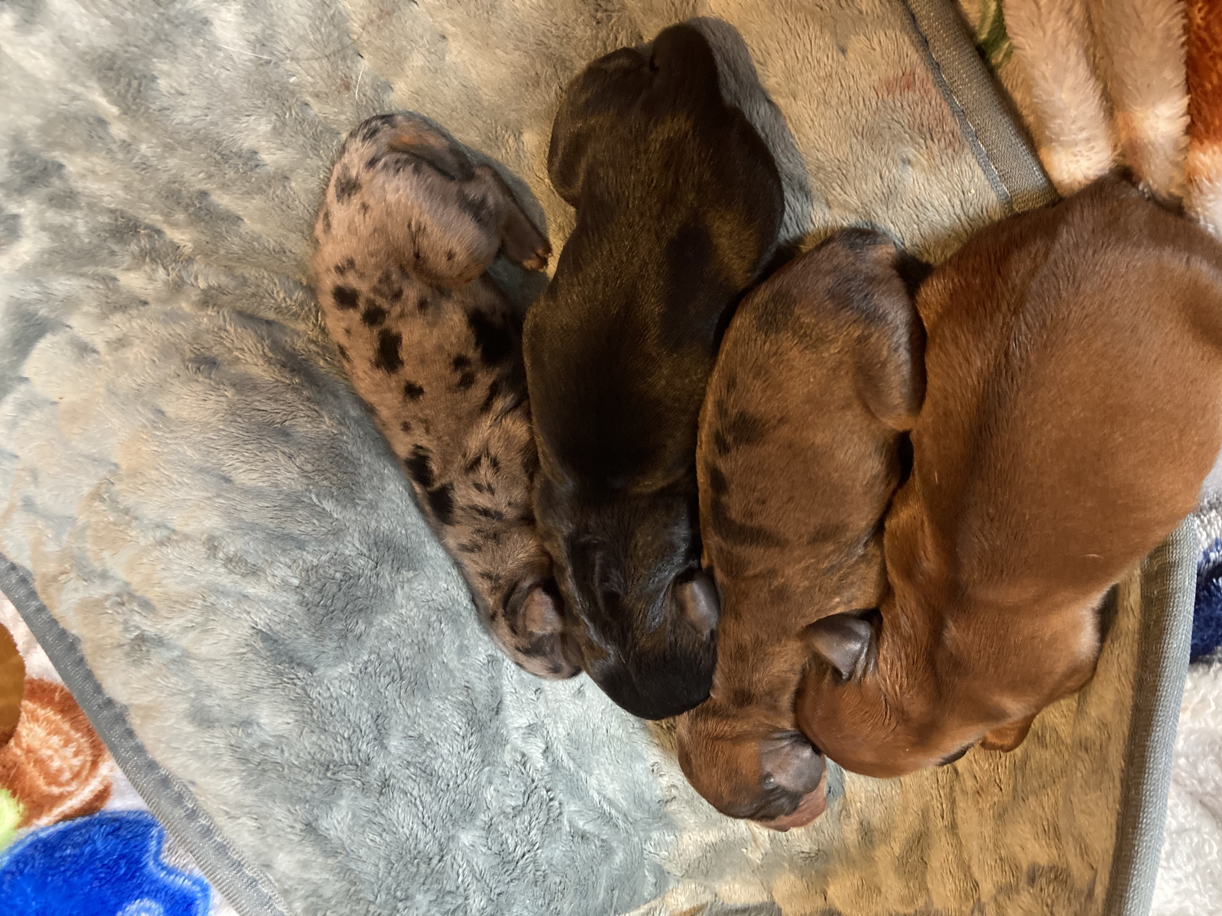 Dachshund puppies include piebald, cream, red, black, chocolate and tan, and dapple. Colors will vary depending on the parent dogs.