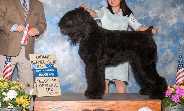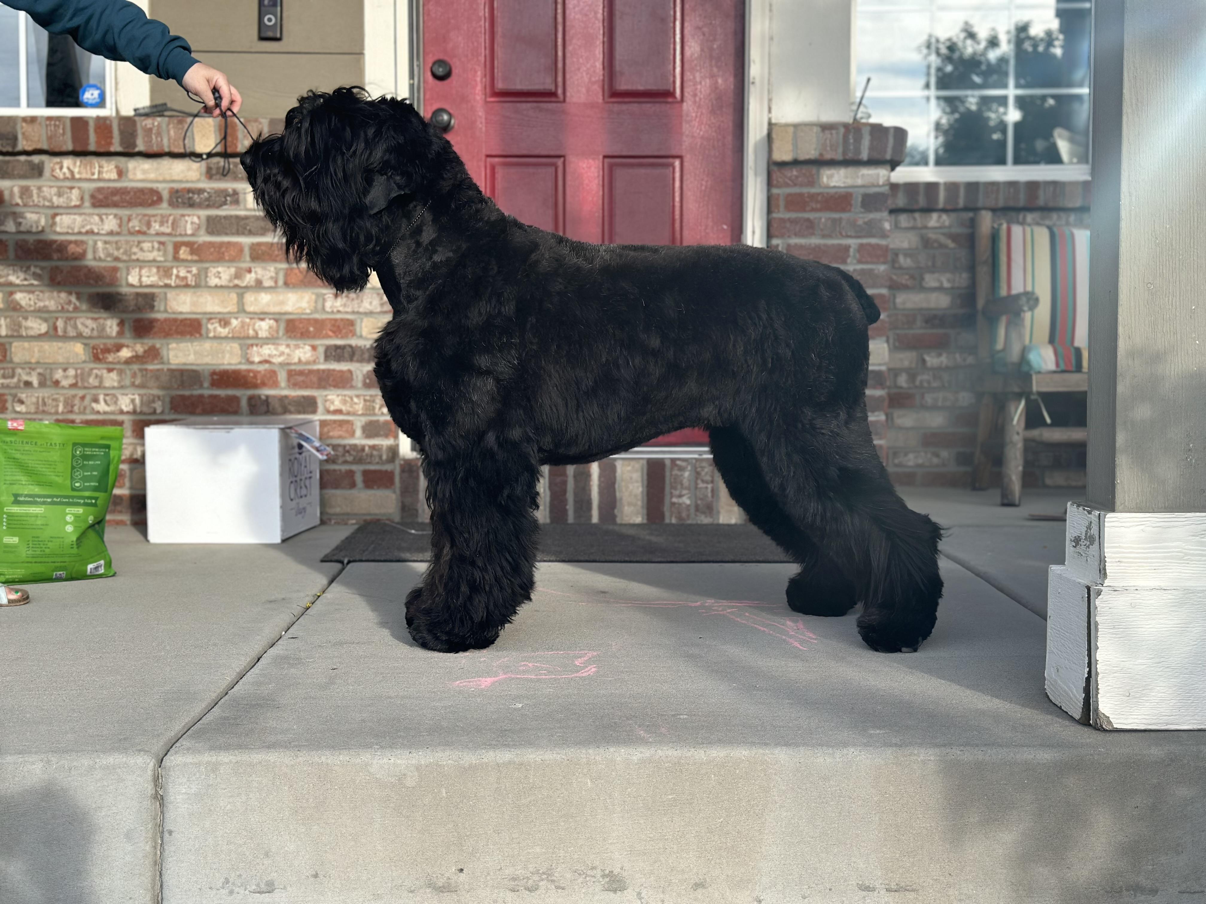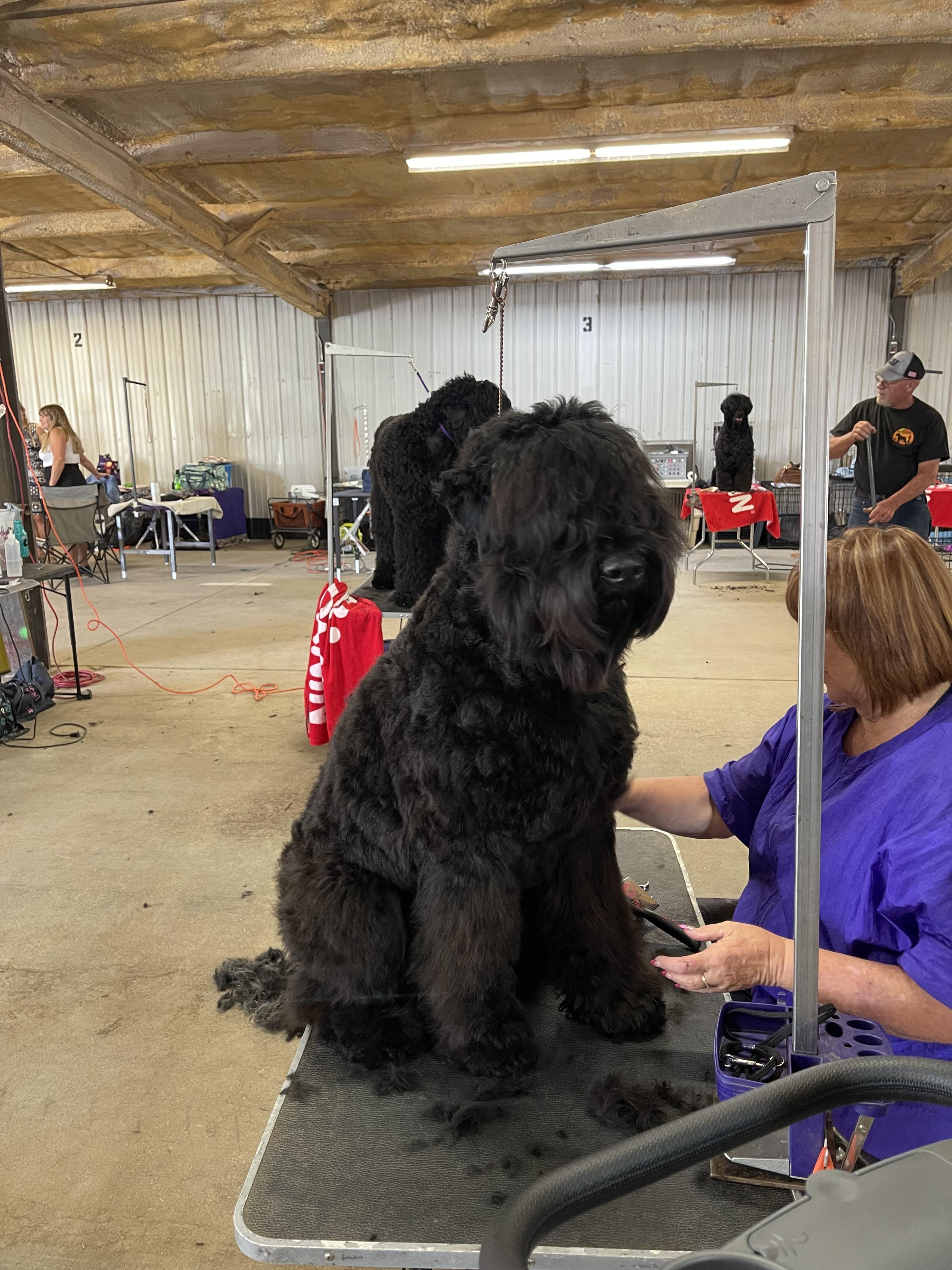 Lilith is a gem. She is hilarious, and a touch ditzy but serious and “with it” when it is called for. She is from my first litter and we have done so much together. She is my first bred by, my first completely owner handled dog, and my first owner handled group placing dog (x2 so far)! She finished her AKC Championship in 2 weekends and is titled toward her Grand Championship. She has been my demo dog for learning the Black Russian Terrier groom and stands perfectly on the table for as long as I need her to. She can be taught anything and gets it super fast. Like her mom, she does some nose work though not as frequently as Amity and I. She and I love to show together. She lights up when she hits the ring, and performs her heart out. She’s a big girl at approximately 28” tall and 110-115 lbs. She has good bone, good substance, and a phenomenal temperament to boot. I am very proud of her and can’t wait to see what the future holds for her!