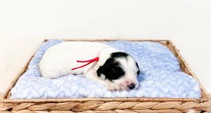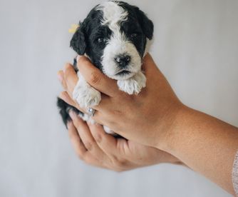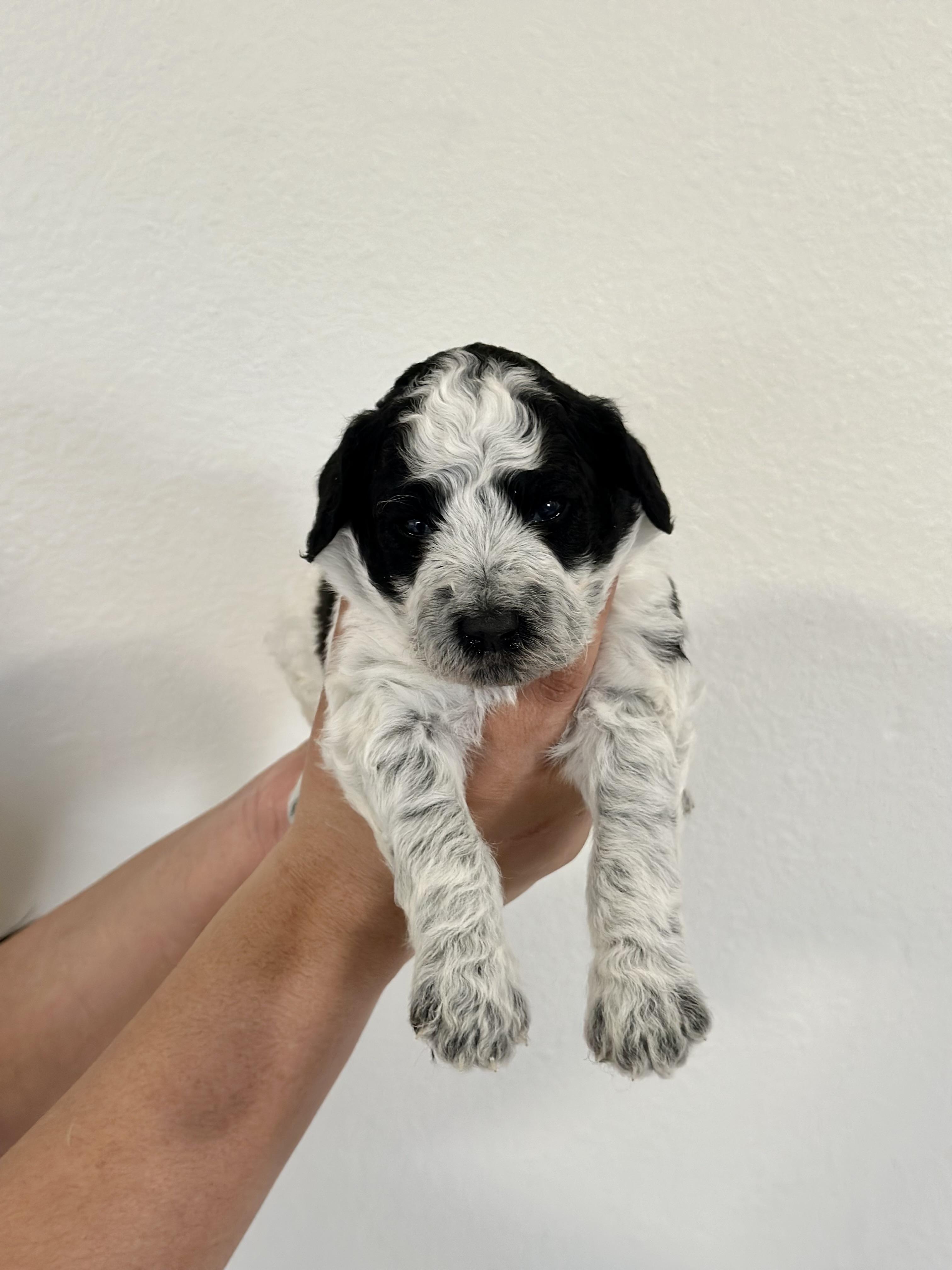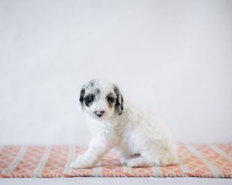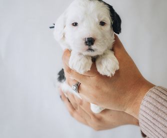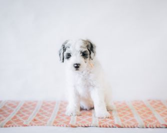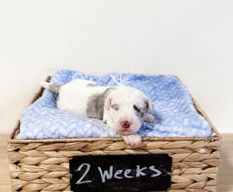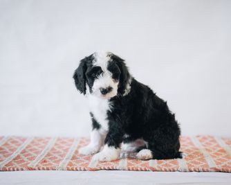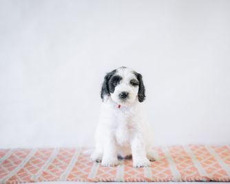Our Sheepadoodle puppies include gray and white, blue merle and white, and black and white. Assorted Doodle Crosses puppies include cream, black, and black and white. Colors will vary depending on the parent dogs.