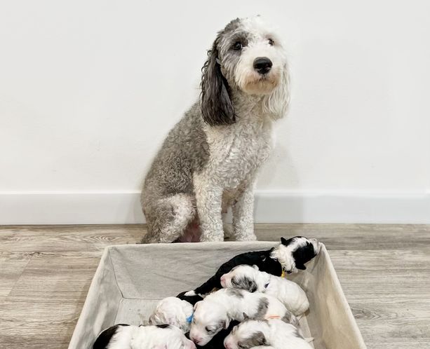 Our Sheepadoodle puppies include miniature and medium sizes. Assorted Doodle Crosses puppies are miniature size. Sizes will vary depending on the parent dogs.