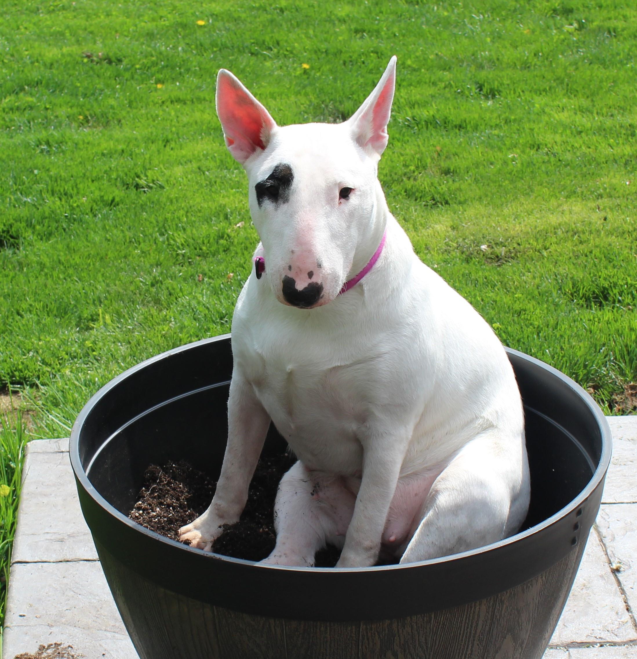 Amy is a female Bull Terrier. Carefully selected as a great representative of her breed, Cleo decided to make her part of their program. Cleo has passed Good Dog’s screening process, which involved a review of their breeding practices, environment, and the mental and physical health of their dogs.