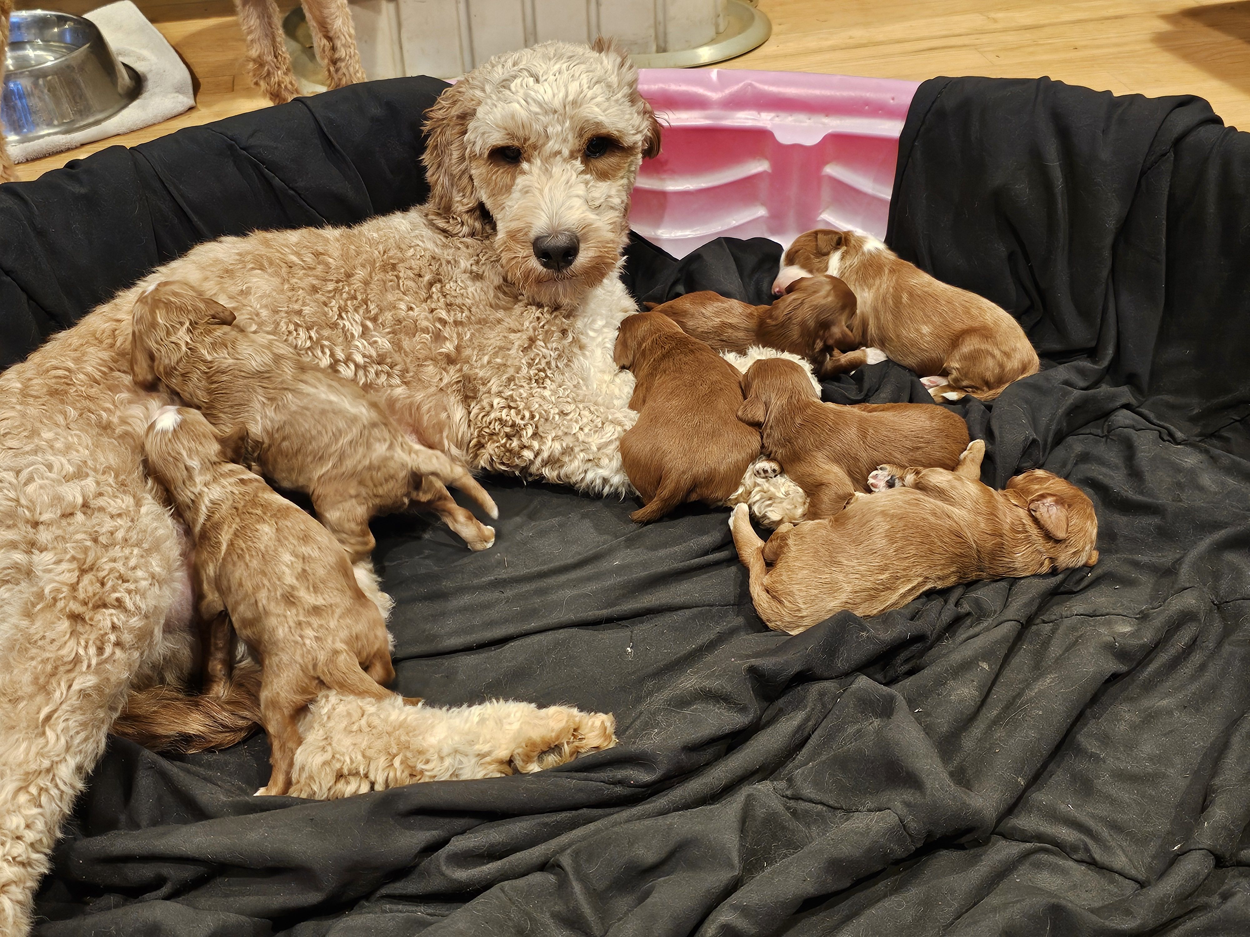 At the time I started I was one of the 1st who wanted to breed Goldendoodle to Goldendoodle and none of the local breeders would support that effort so I purchased my initial dogs Ginger and Angel in Ohio and Crash in S. Carolina a year later.