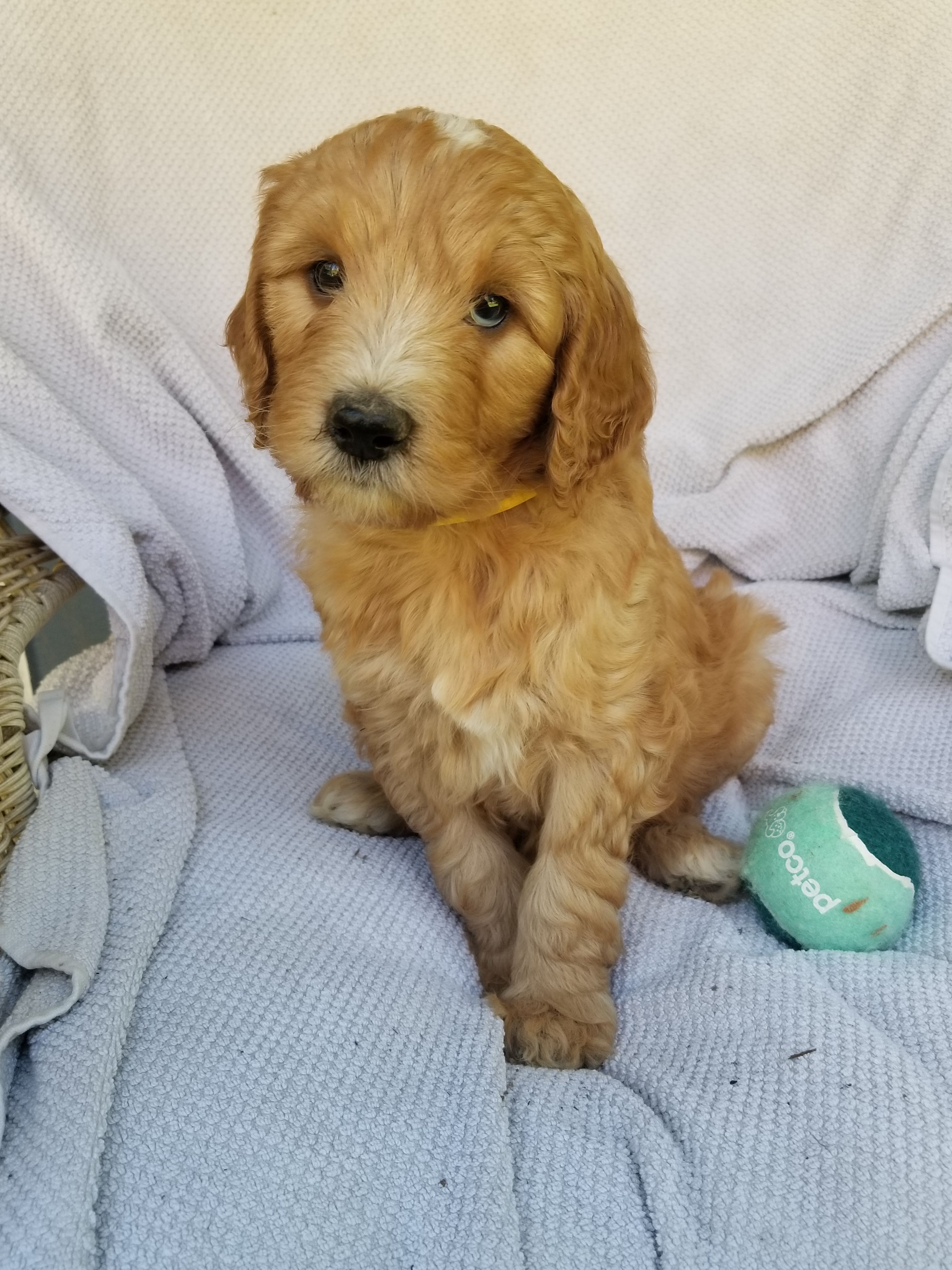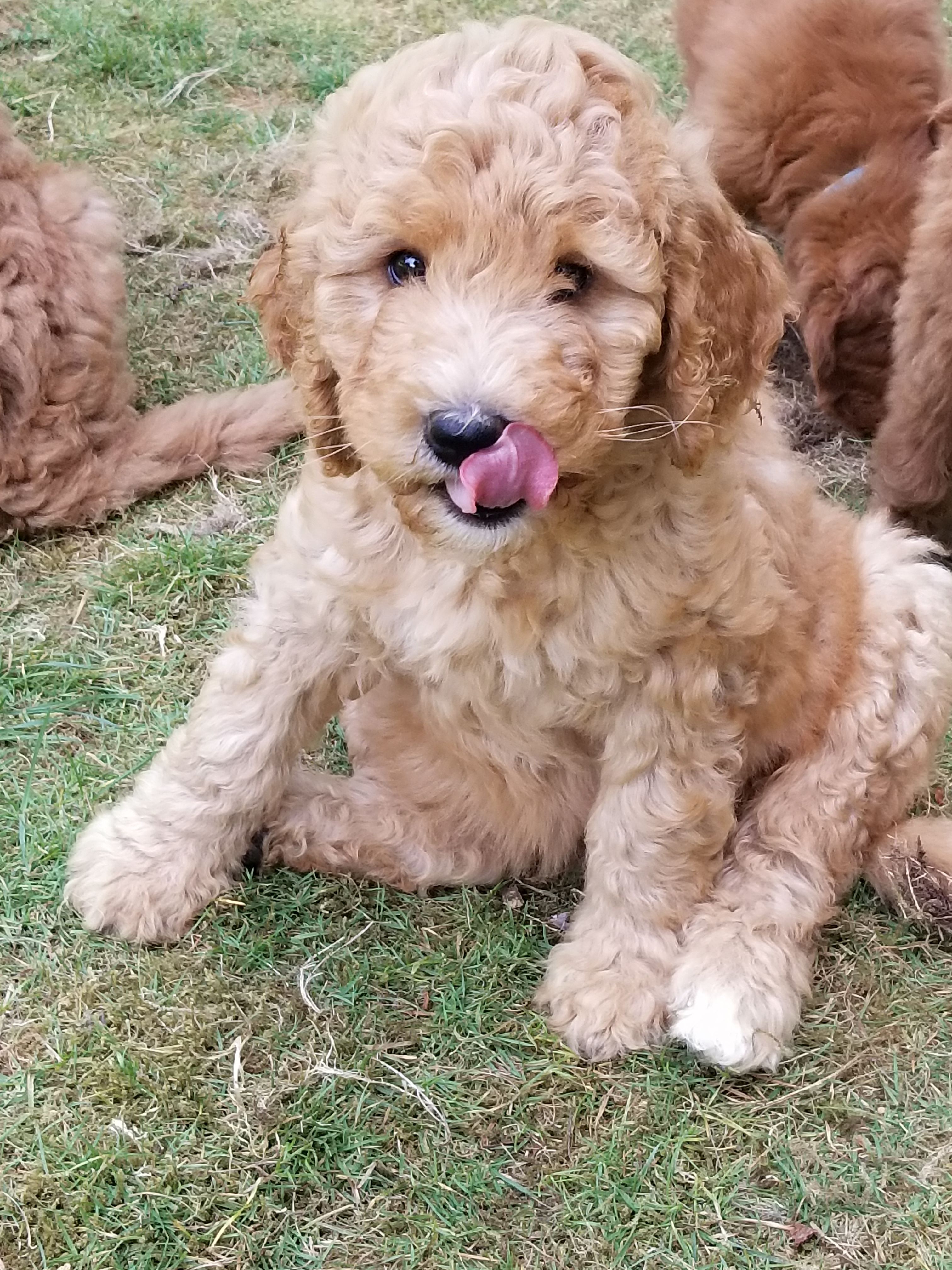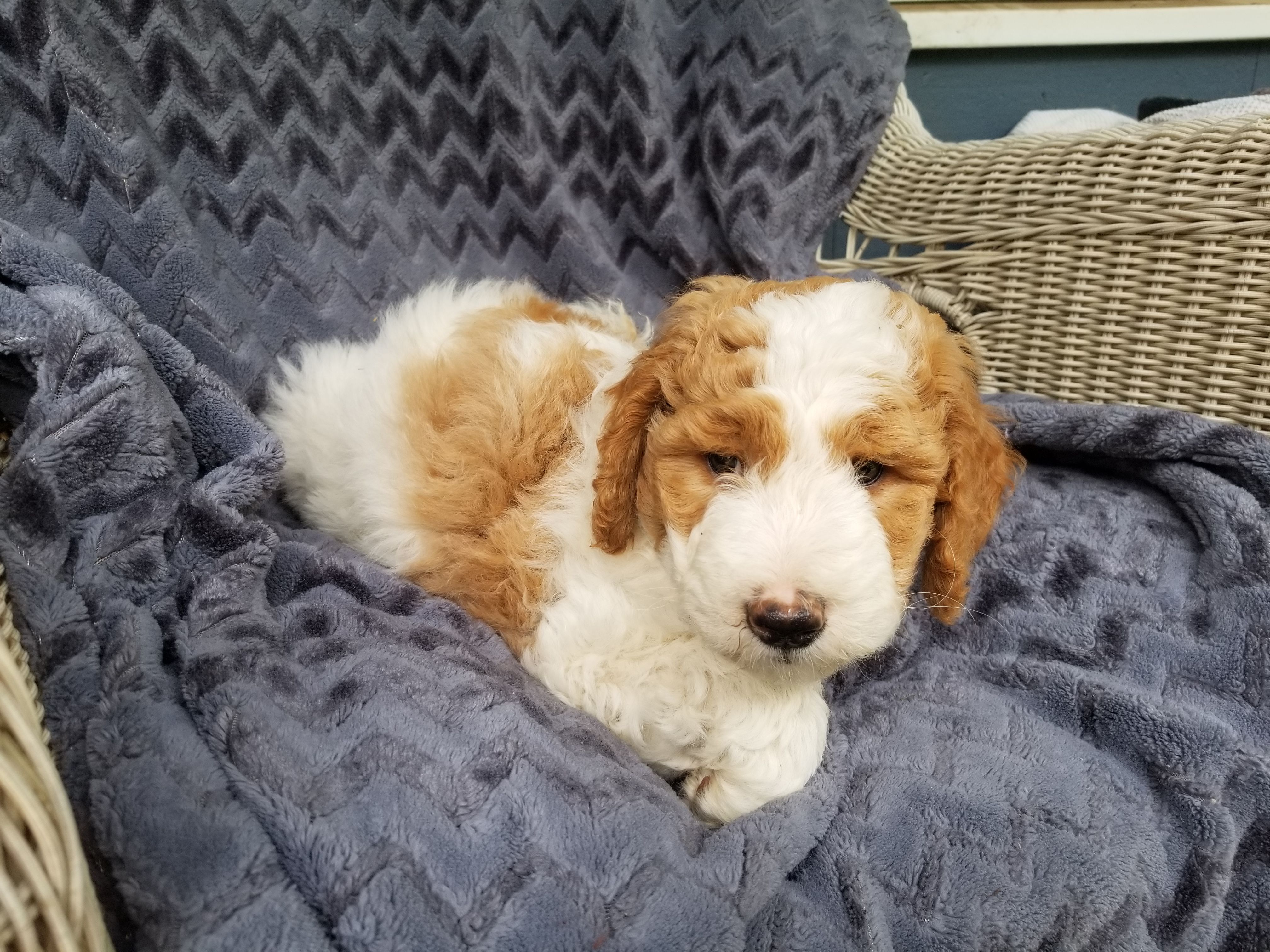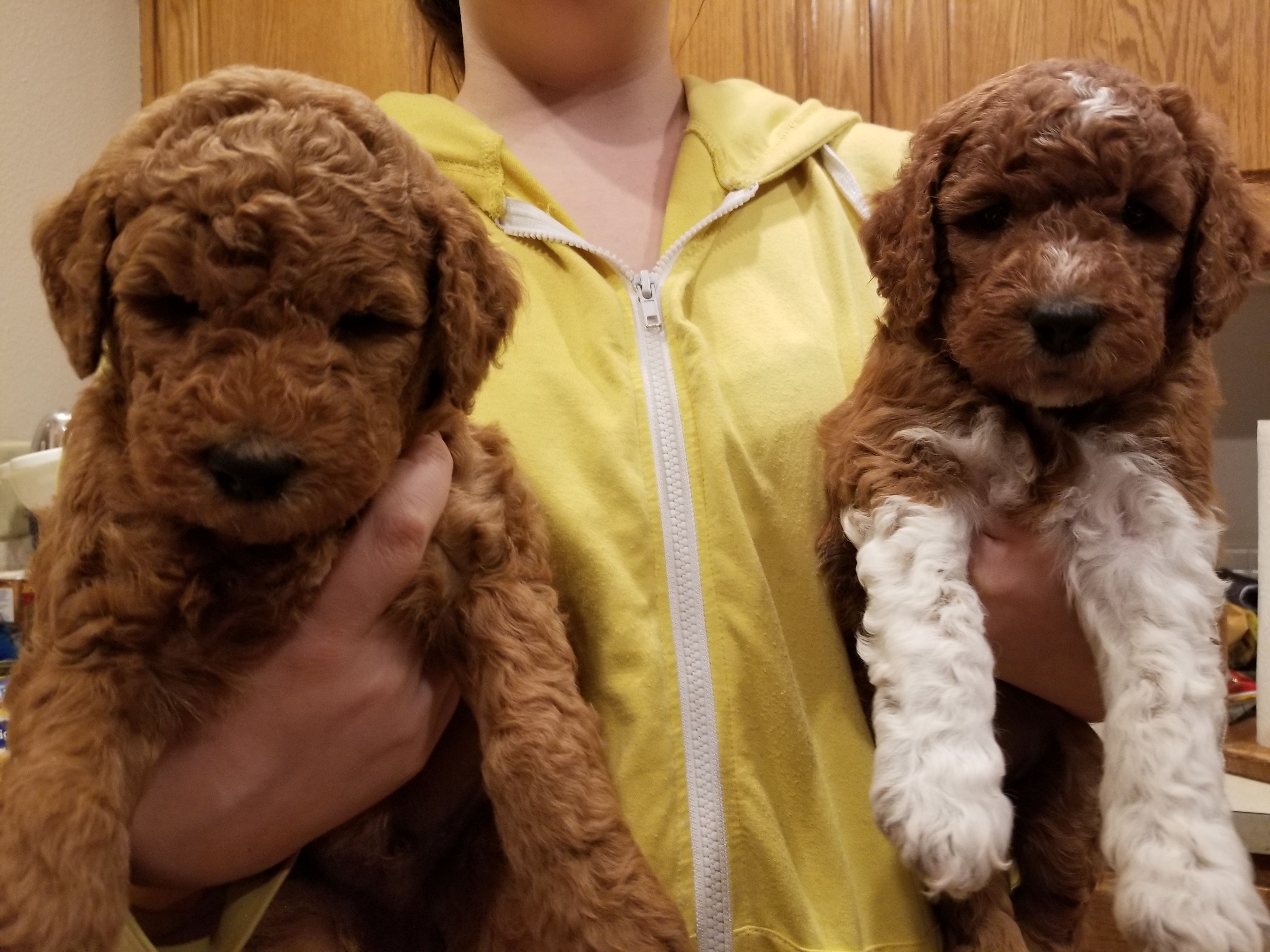 Our Bernedoodle puppies are black and white. Goldendoodle puppies include cream, apricot, red, and parti. Colors will vary depending on the parent dogs.
