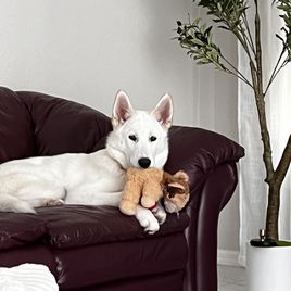 Laika is the second dam to enter our program. She grew up with Nyx our other dam. She’s extremely sweet and such a gorgeous girl, she has a standard coat is full white with some cream points, pink nose and bright blue eyes.