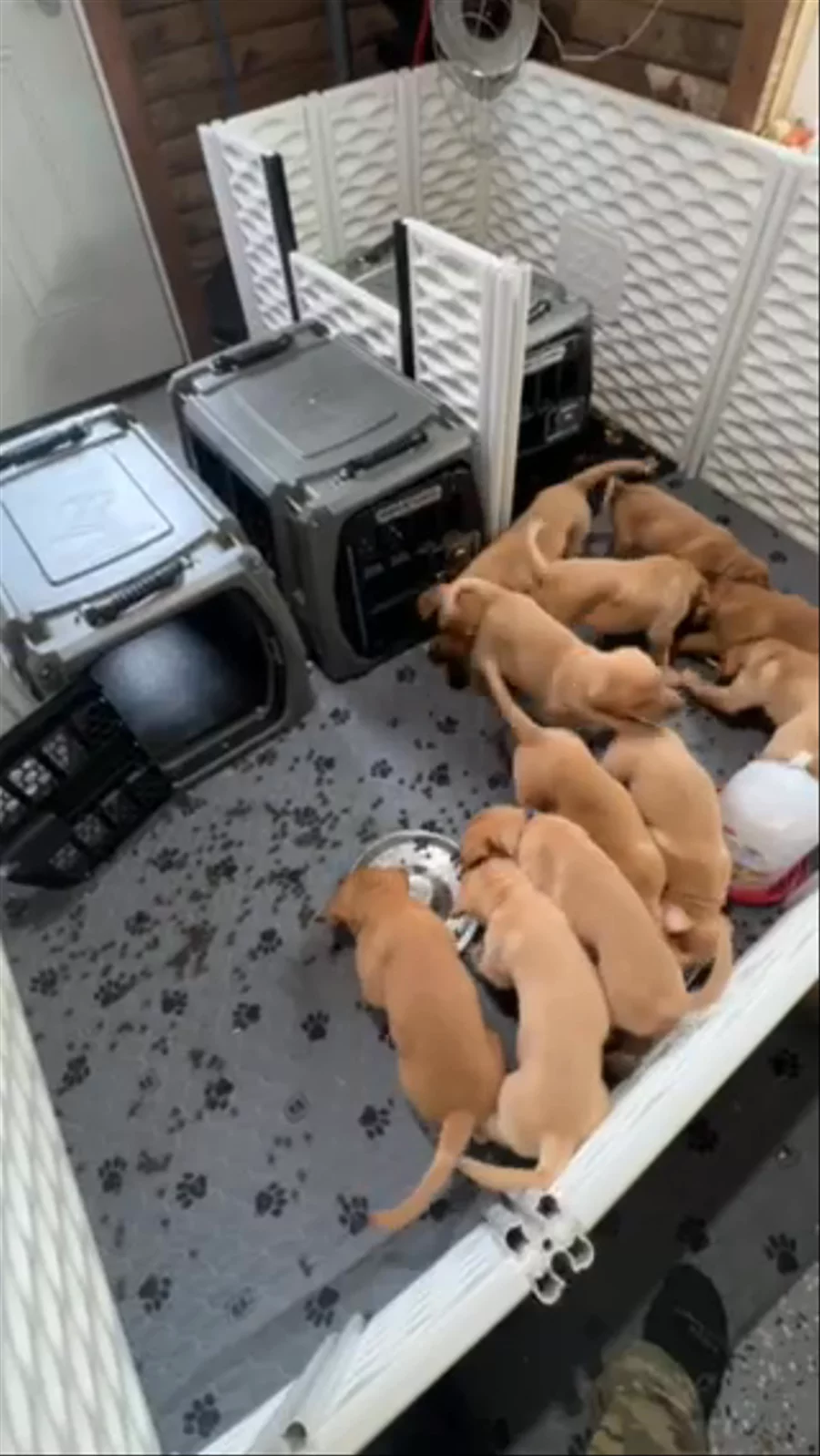 Kennel exposure night 1. Over the next few weeks we will have them exposed and crated in these kennels. This experience will prepare them for trips to the vet, out in town, and traveling to their new homes.