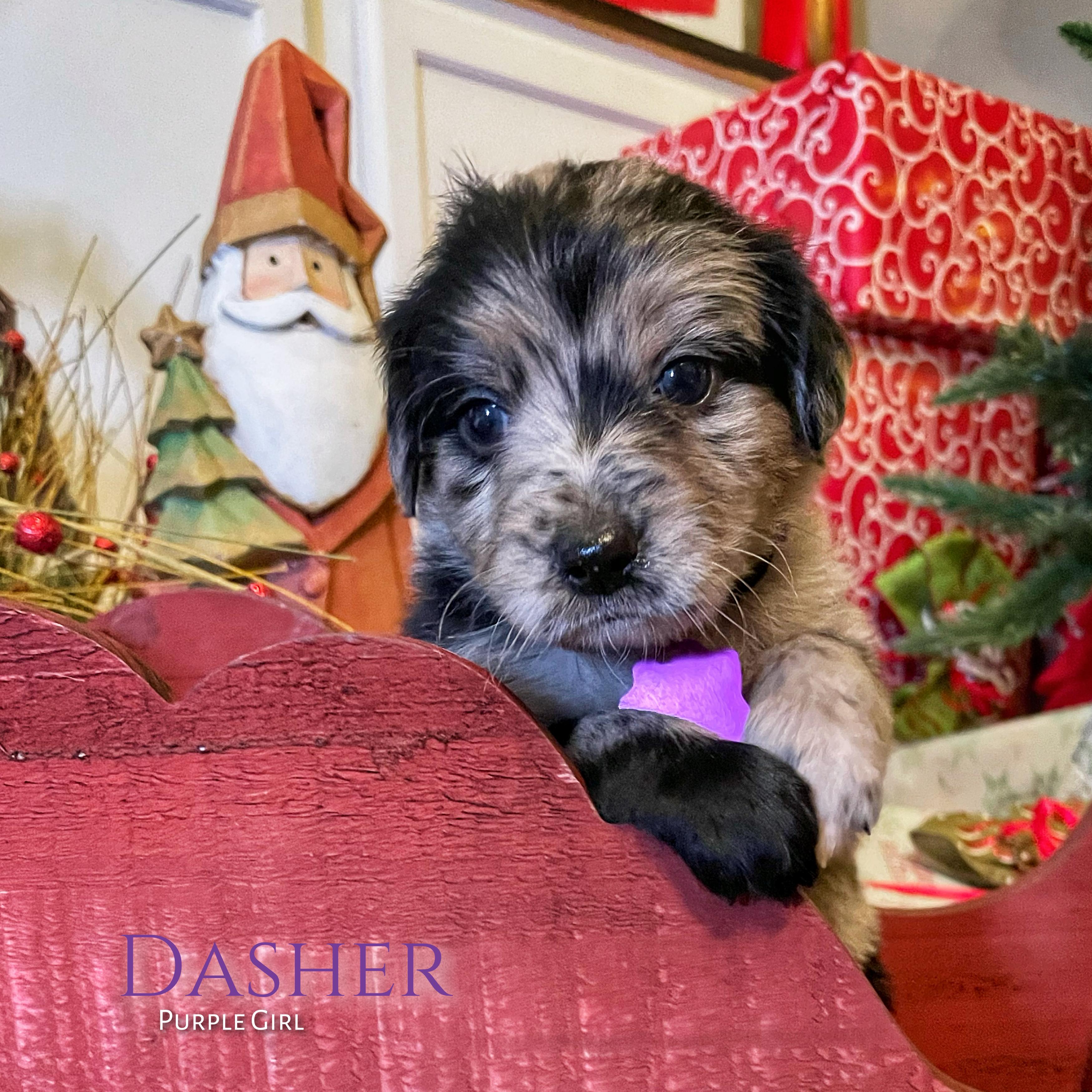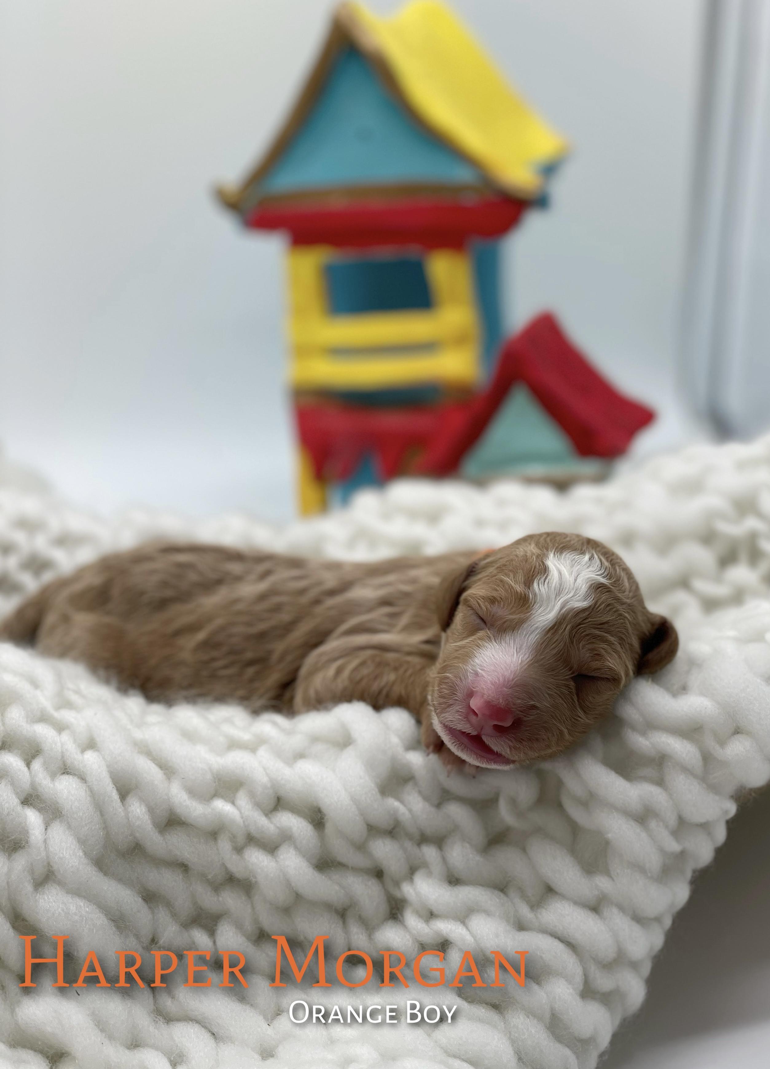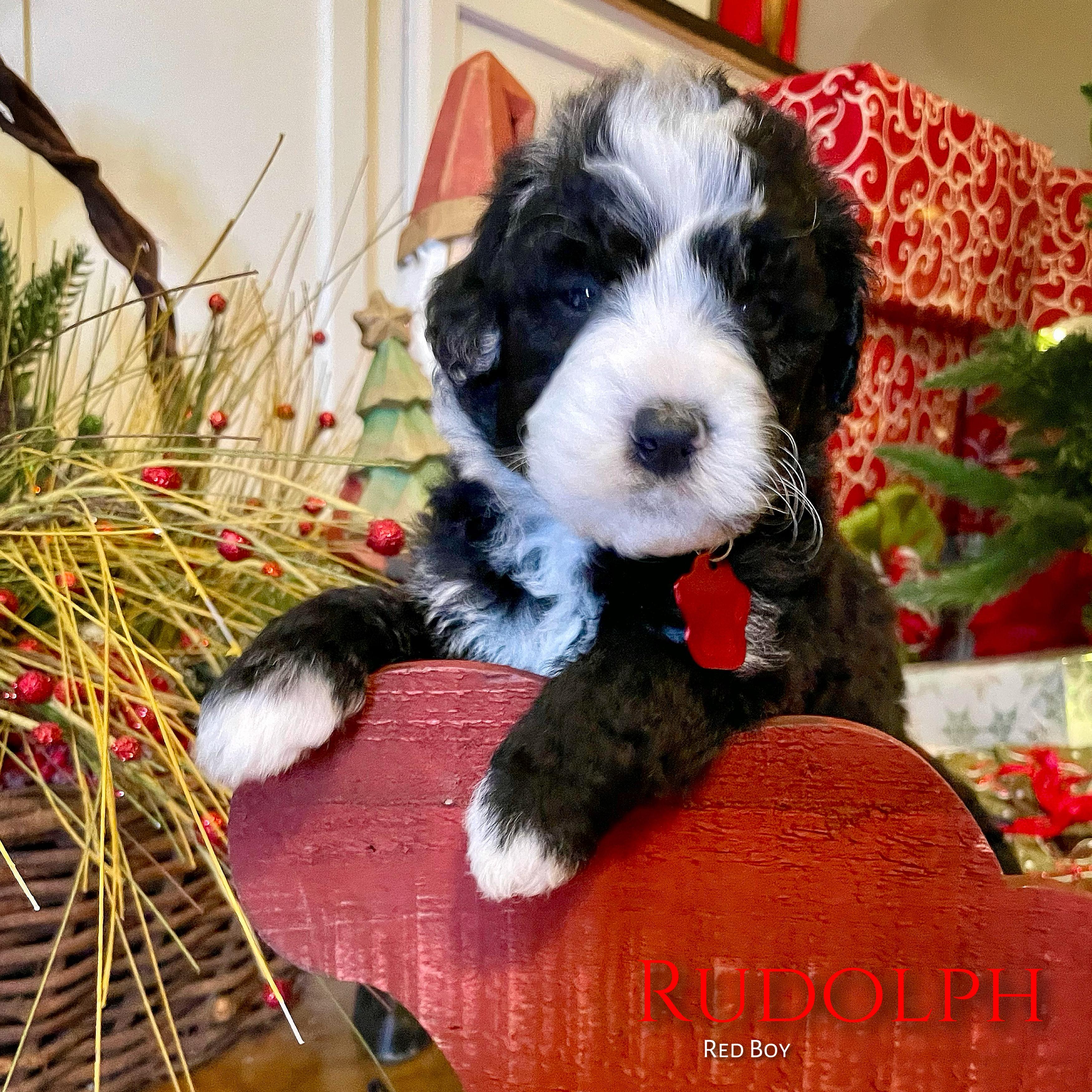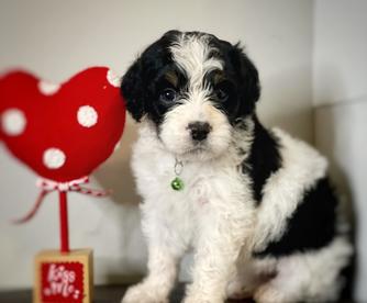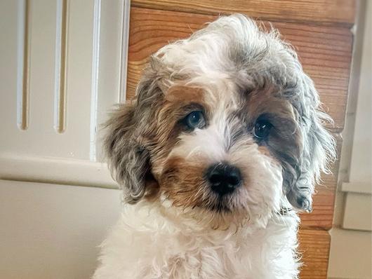 Our Bernedoodle puppies include brown, black and white, and merle. Goldendoodle puppies include apricot, red, and parti. Colors will vary depending on the parent dogs.