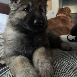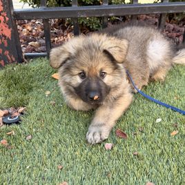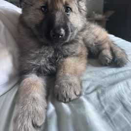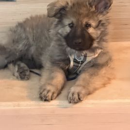 We searched for a few months for the right fit of a GSD Breeder. Kari at Oakmont Shepherds more than took care of our needs. This is our first puppy from a breeder and we had a lot of questions regarding health and temperament. We were looking for a long haired/ low drive GSD to be a companion to our 8 year old mild tempered GSD mix. Kari gave us reassurances about the health of the parents and that comforted us a lot. We identified a few possible puppy candidates and Kari helped share a bit more information about them. That’s how we found our boy Gustavo or Gus. His parents are Torin and Ember and he was born on 8/17/25. He’s looking a lot like Torin at 3 months old. He has such a sweet disposition, and he likes to look at you and study your face. He’s the perfect dog for us, and Kari was delightful to work with. If you’re in search of dogs with sweet temperaments, she can help.