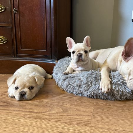 Our French Bulldog puppies include cream, fawn, tricolors, and black and tan. American Bully puppies include lilac tri-color and chocolate tri-color. Colors will vary depending on the parent dogs.