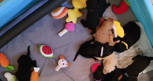 Puppies are sent home with a goodie bag that includes: Vet Records, Food Starter Bag, Puppy Collar, Blanket with Mom's Scent & Toy with Littermates' Scent.