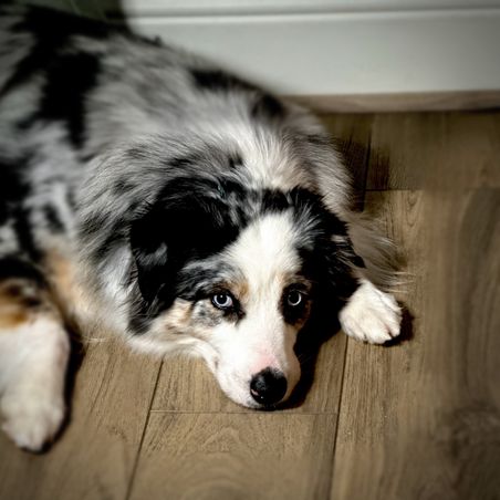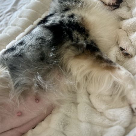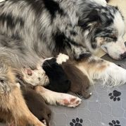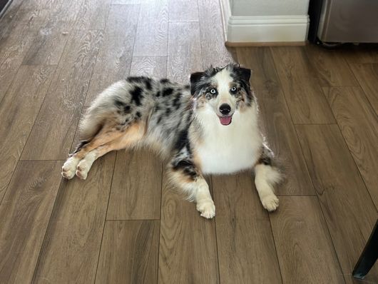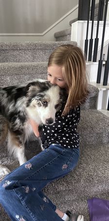 Skye is a low drive, medium energy, standard Australian Shepherd who prefers long days of snuggling on the couch over chasing balls in the Texas heat! She is equal parts of unwavering obedience, wiggle-butt, and "don't tell a princess what to do!" Skye has a stunning coat, goofy personality, and loves her people to the moon and back. She has exceeded all of our expectations in her mothering instincts and is raising a litter of confident, well loved puppies!