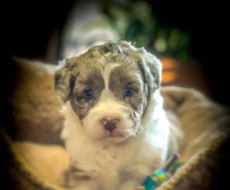 Our Poodle puppies include apricot, brown, cafe au lait, cream, parti, and phantom. Aussiedoodle puppies include blue merle, red merle, black phantom, black and white, black tri-color, red phantom, and red tri-color. Colors will vary depending on the parent dogs.