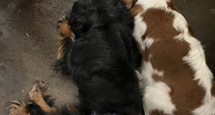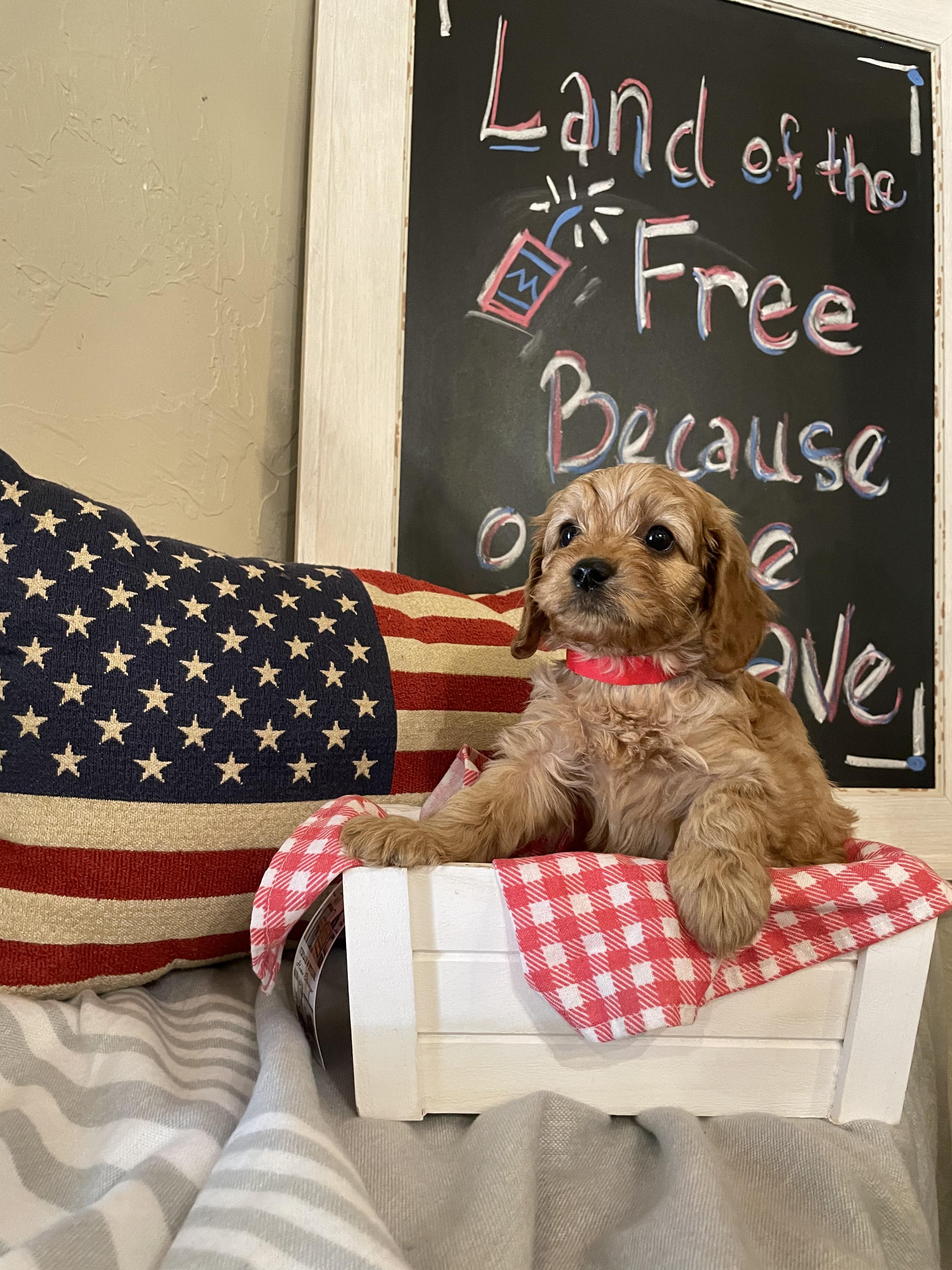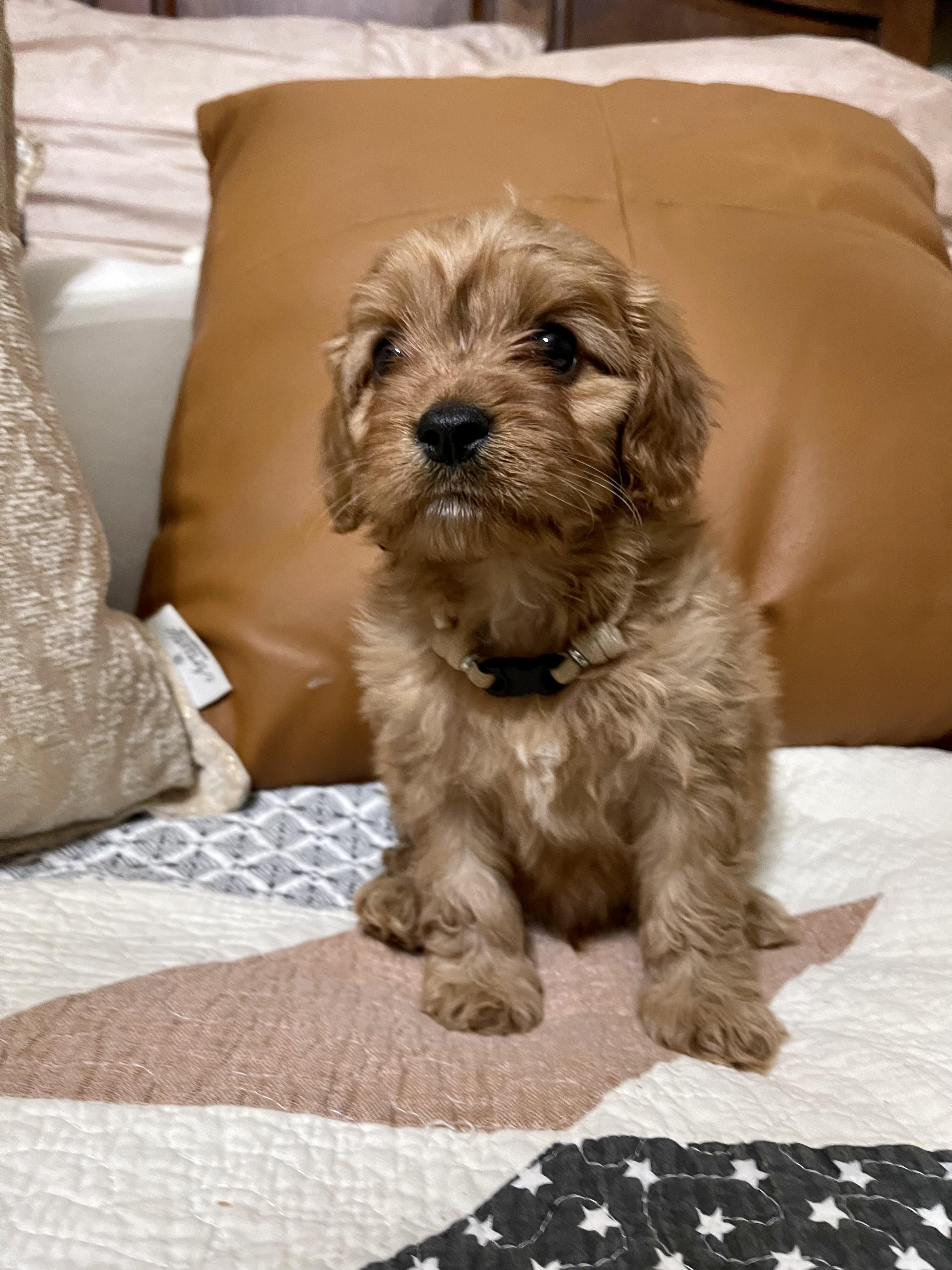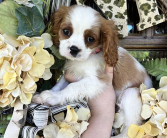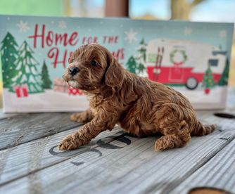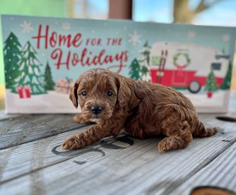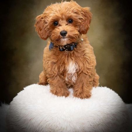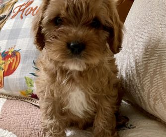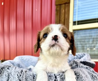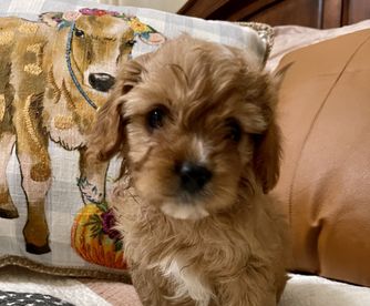 Our Cavapoo puppies are red. Cavalier King Charles Spaniel puppies include blenheim, ruby, tri-color, and black and tan. Colors will vary depending on the parent dogs.