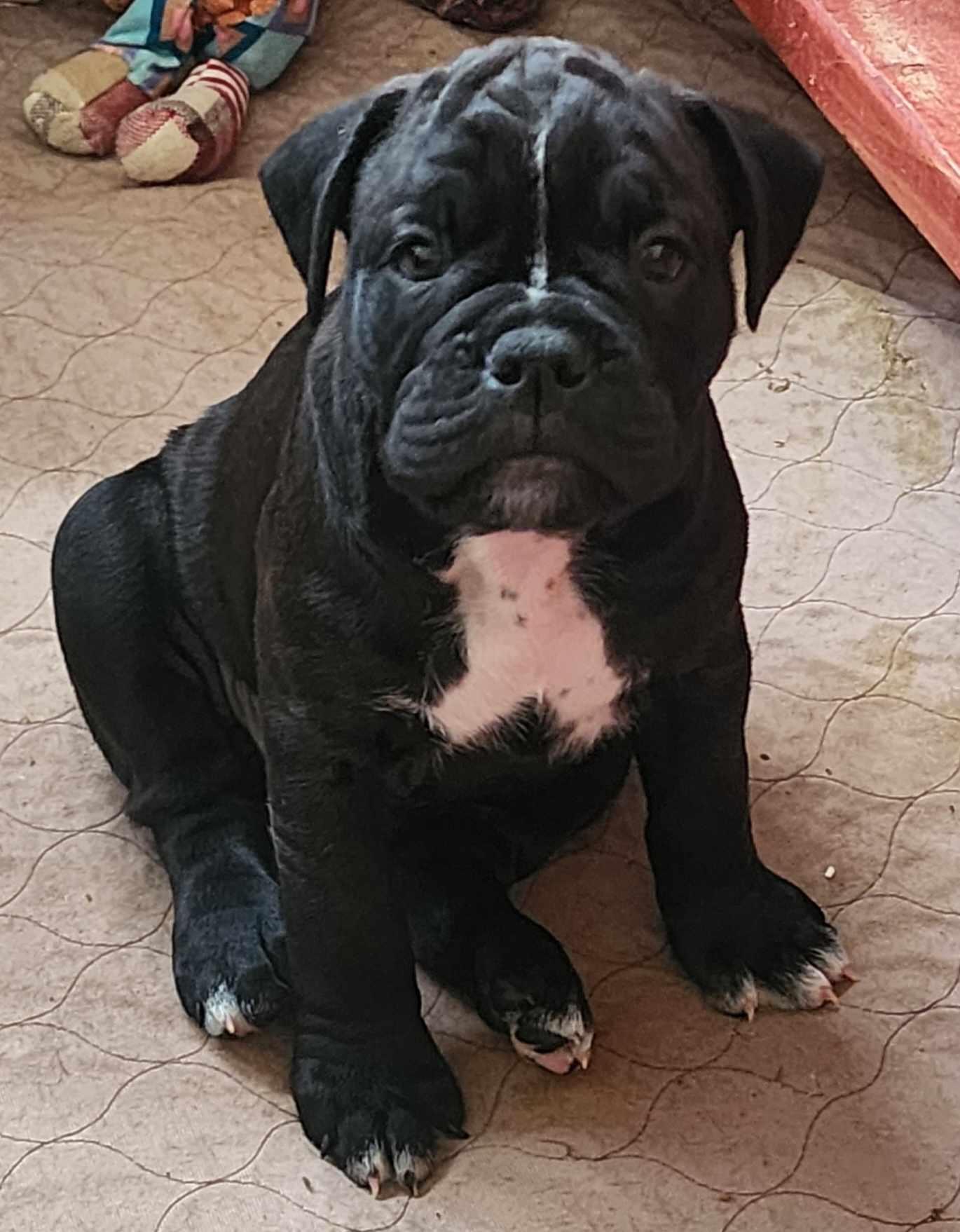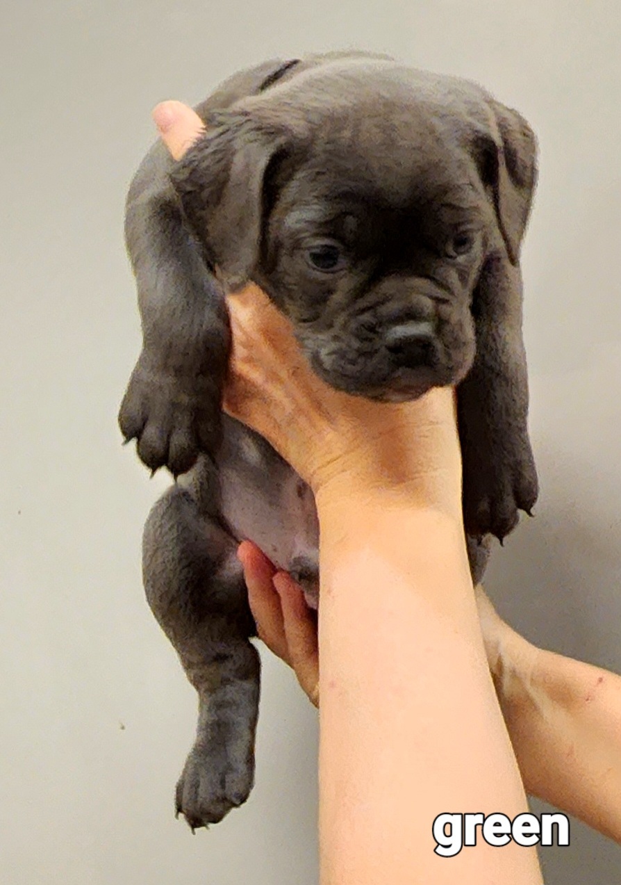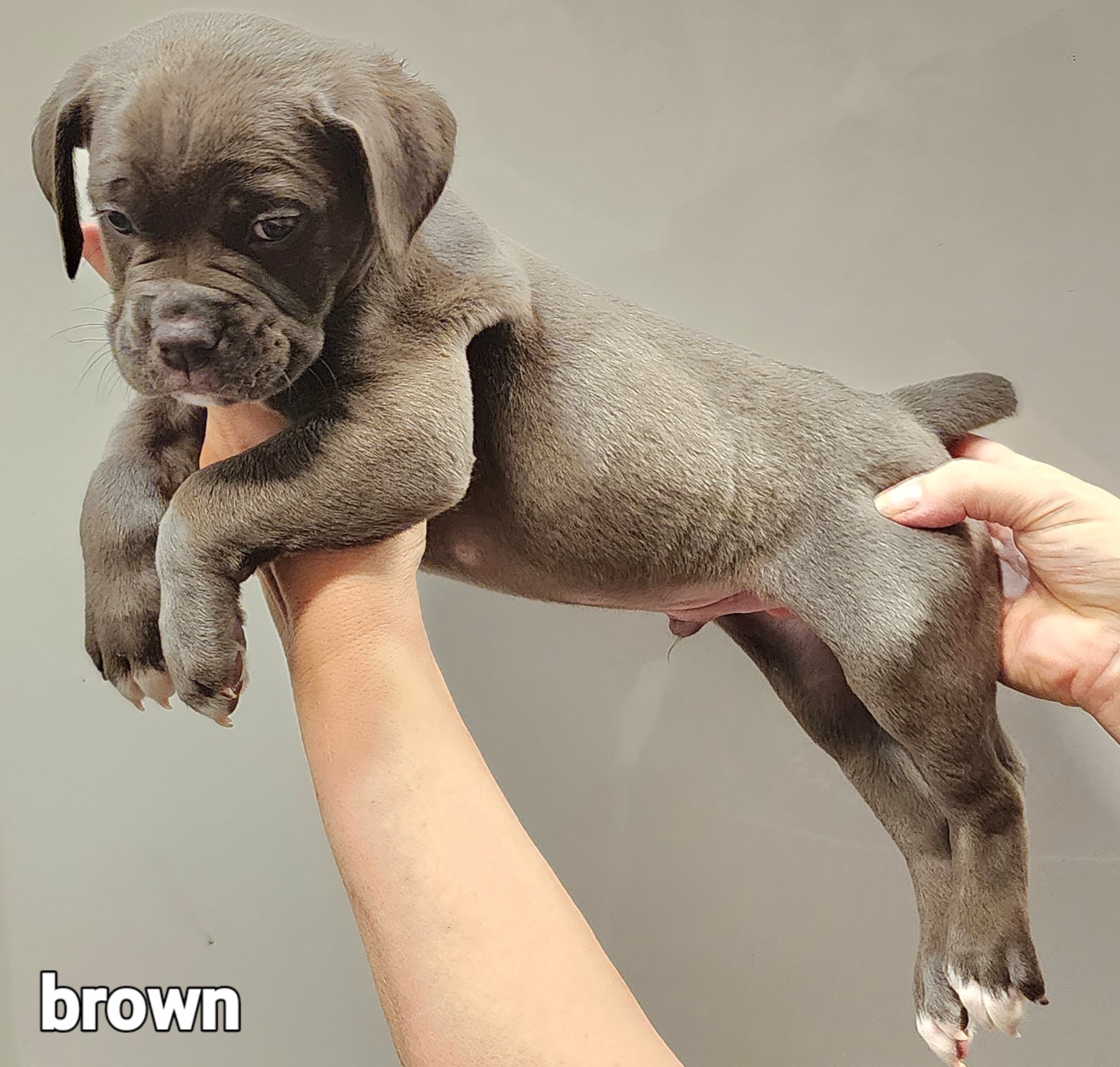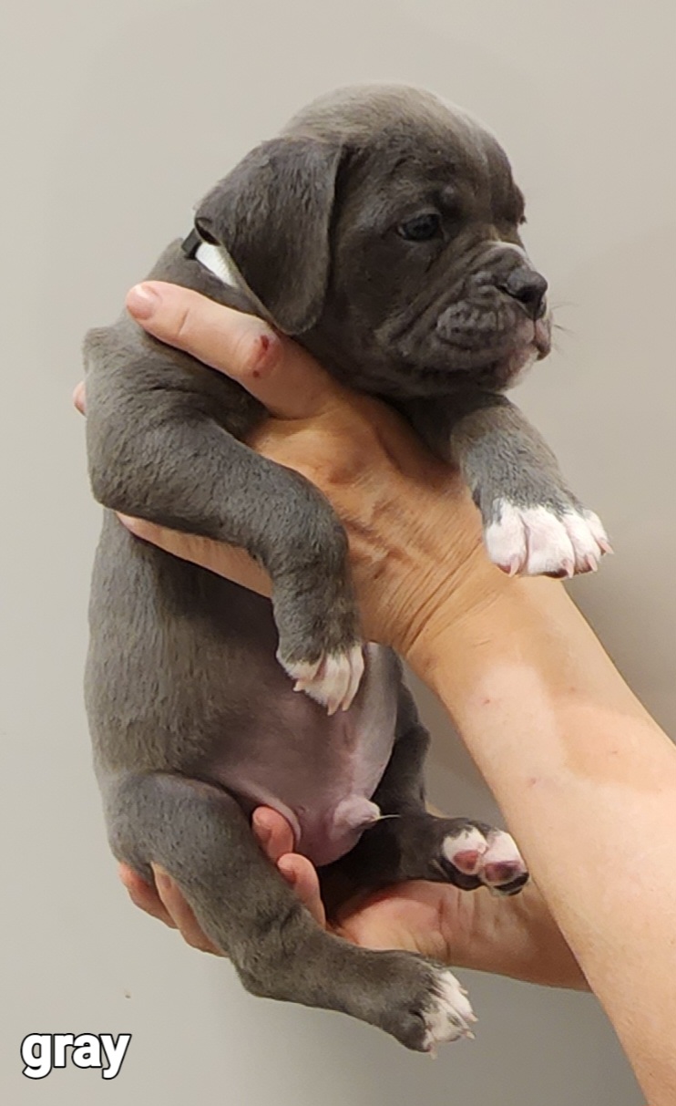 Our puppies include brown brindle and black and white. Colors will vary depending on the parent dogs.