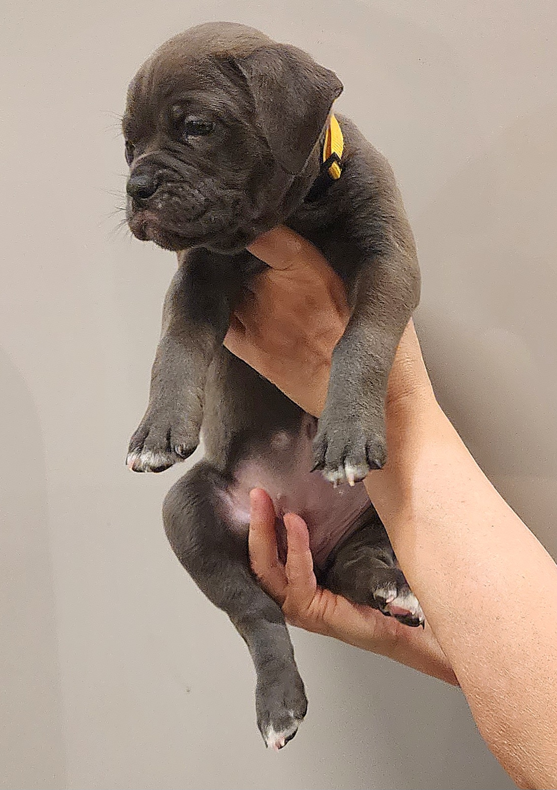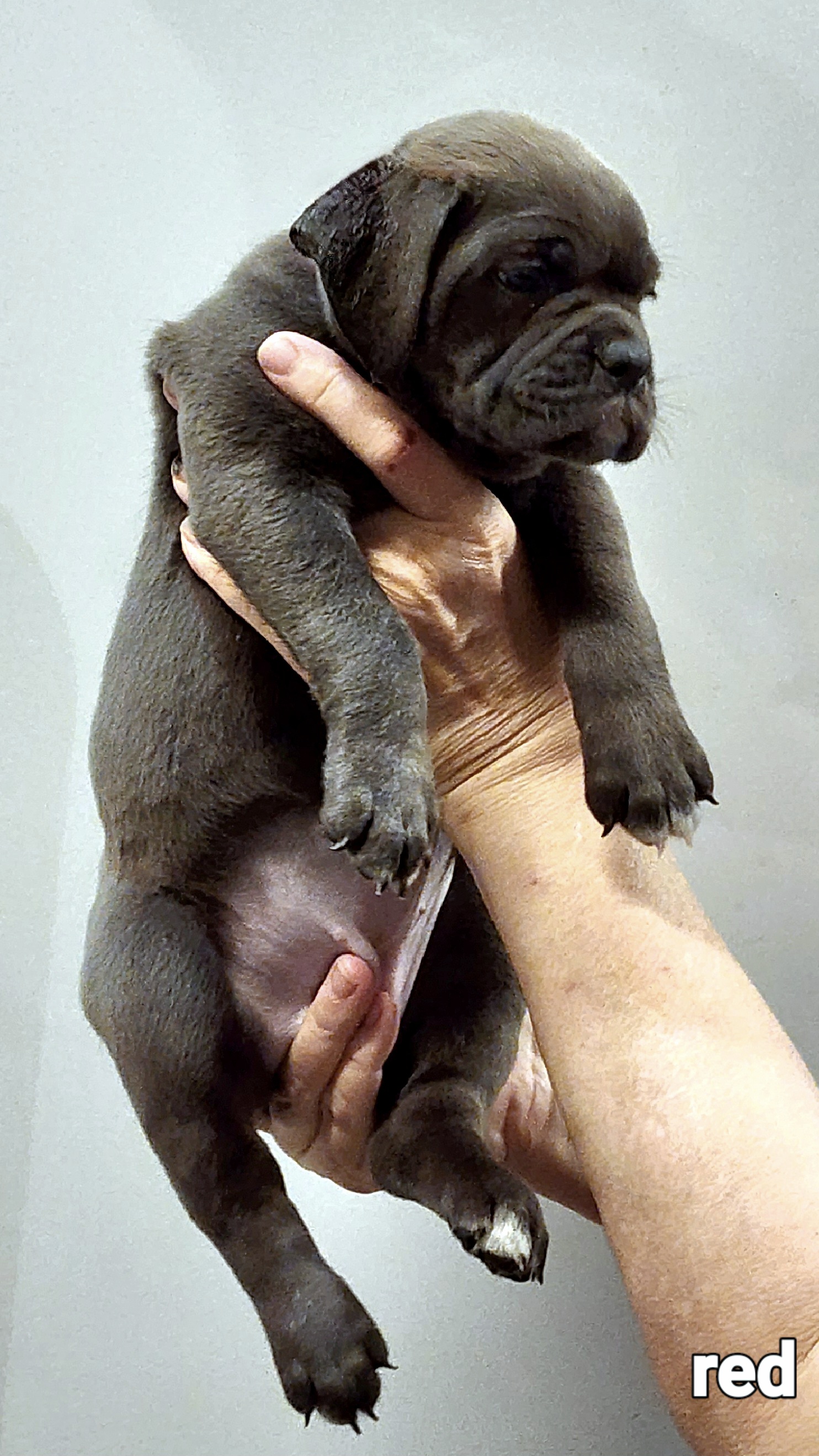 She is super affectionate, and it shows with her litter. She is a triple carrier genetically. She lives in a guardian home with Titan, the sire, but is staying with us for the entire whelping of her puppies. We sure are glad to have her here on the farm. She is super athletic!!! She loves to run full speed, and she can jump at least 10 feet straight out. She is a workhorse. Super muscular and so strong. Though with all this strength, she is as gentle as can be and very well mannered. She tends to her puppies with such tender love. We could not have asked for a better mommy than her.