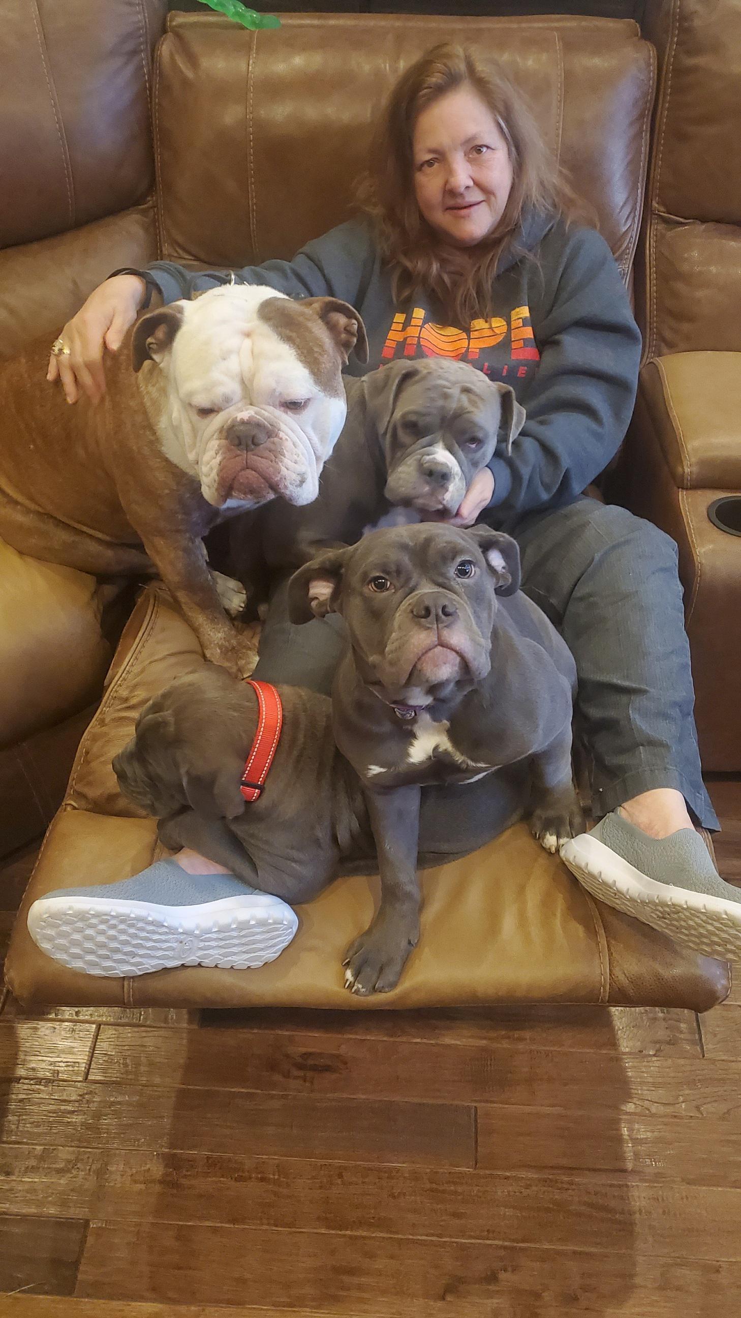 We fell in love with the Olde English Bulldogges the day we took our Chester home from the breeder. Six months later, we decided that we MUST breed these beautiful loving animals, so we bought our next Bulldogge, Izza Belle, and our breeding journey began. Izza Belle has produced beautiful puppies. We have recently purchased a new female and kept a male from her latest litter to add to our breeding program. We also own an up and coming blue brindle female who will be breeding near the end of 2023.
