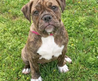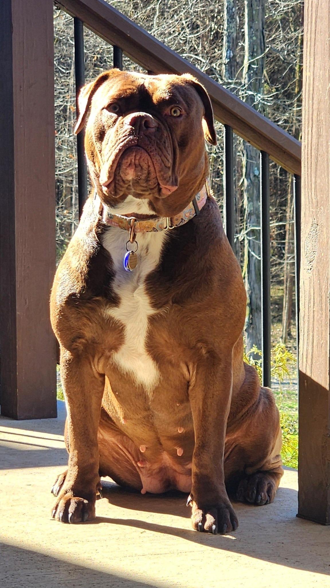Izza is a female Olde English Bulldogge. Carefully selected as a great representative of her breed, Ruth decided to make her part of their program. Ruth has passed Good Dog’s screening process, which involved a review of their breeding practices, environment, and the mental and physical health of their dogs.