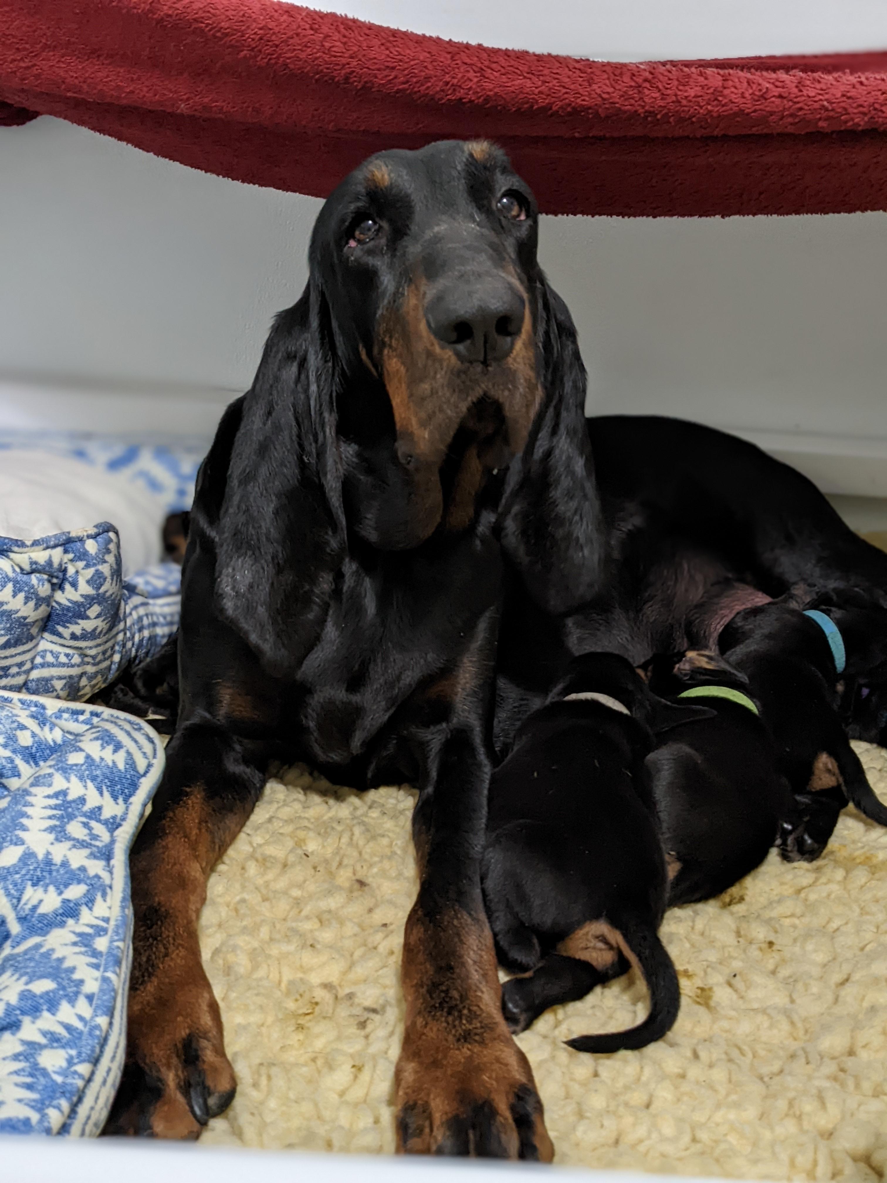 Amelia is a female Black and Tan Coonhound. Carefully selected as a great representative of her breed, Raven decided to make her part of their program. Raven has passed Good Dog’s screening process, which involved a review of their breeding practices, environment, and the mental and physical health of their dogs.