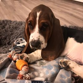 Jackie is a top notch breeder. She is passionate about the Bassett Hound breed and it is obvious that she takes excellent care of her dogs. She updated us with pictures and videos of our puppy. She answered all of our questions promptly throughout the process. We can’t believe how well adapted our puppy came to us. She whined when we left but allowed us to comfort her and settled in my lap shortly into our 3 hour car ride. She was easy to put down to bed simply sitting by her playpen for 5-10 minutes each night and she slept through the night from the third night. She adapted to our schedule in less than a week and we were able to return to work. When we checked on her on our camera, we were amazed at how she ate and drank from her bowls attached to her playpen like Jackie had set up and then returned to sleep. She has been extremely easy to potty train with the training Jackie started. She goes on a pad in the back of her playpen when we aren’t home and is eager to go outside for us when we are home. We feel truly grateful for all the support Jackie has given us to help make our family complete with our newest addition Addy.