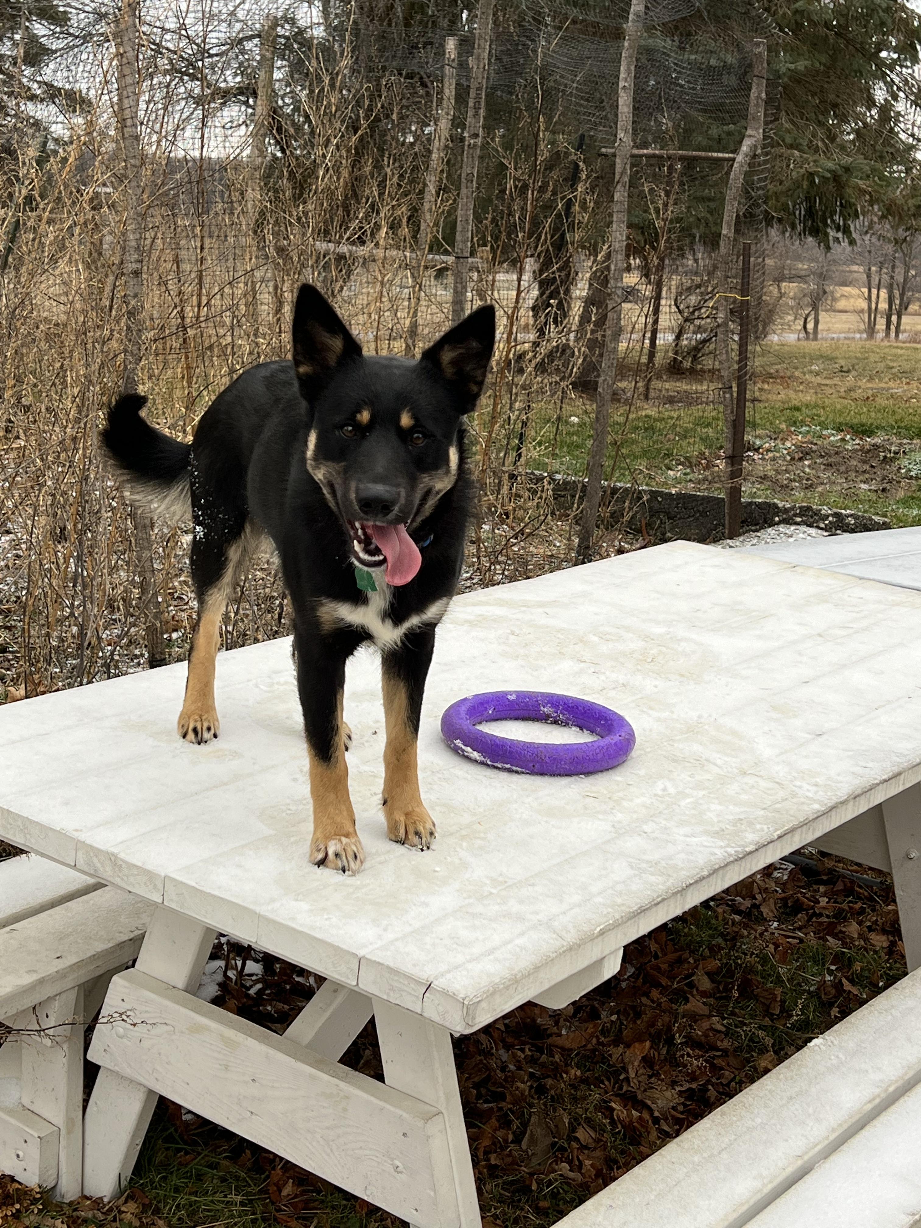 Annukka, so sweet and submissive, and would love nothing more than to live inside me...she is such a devoted companion. Very primitive in nature, she spends much of her time hunting in our field. Not one for much play but she will hike with me to the end of the earth. She is very bright and even more obedient. She is a beautiful girl, and we love her to pieces; even if she does go after the occasional skunk.