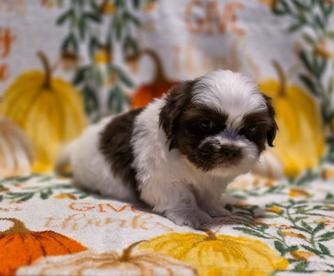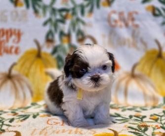 Our Shih Tzu puppies include tricolor, black, blue, brindle and white, black and white, blue and white, liver and white, and brindle. Shichon puppies include cream, silver, black and white, and brown and white. Shihpoo puppies include black white and silver, liver and white, blue and white, and black and white. Poodle puppies include apricot, black, red, parti, and phantom. Colors will vary depending on the parent dogs.