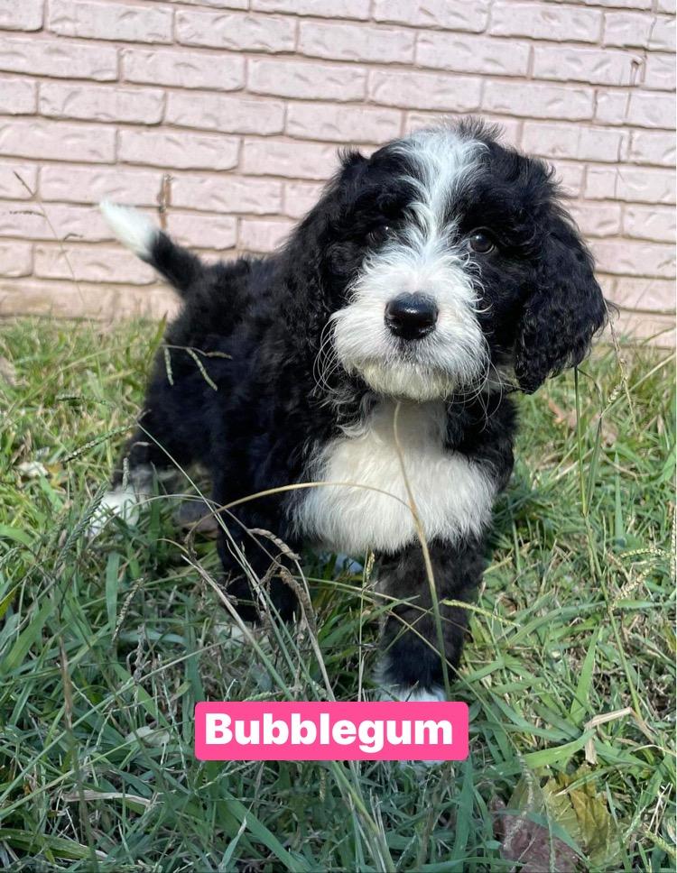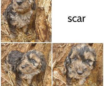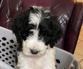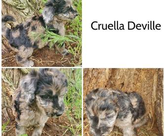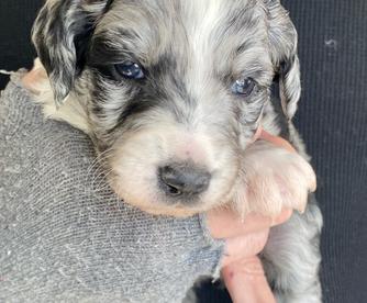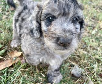 Aussiedoodle puppies include blue merle, red merle, and black and white. Colors will vary depending on the parent dogs.