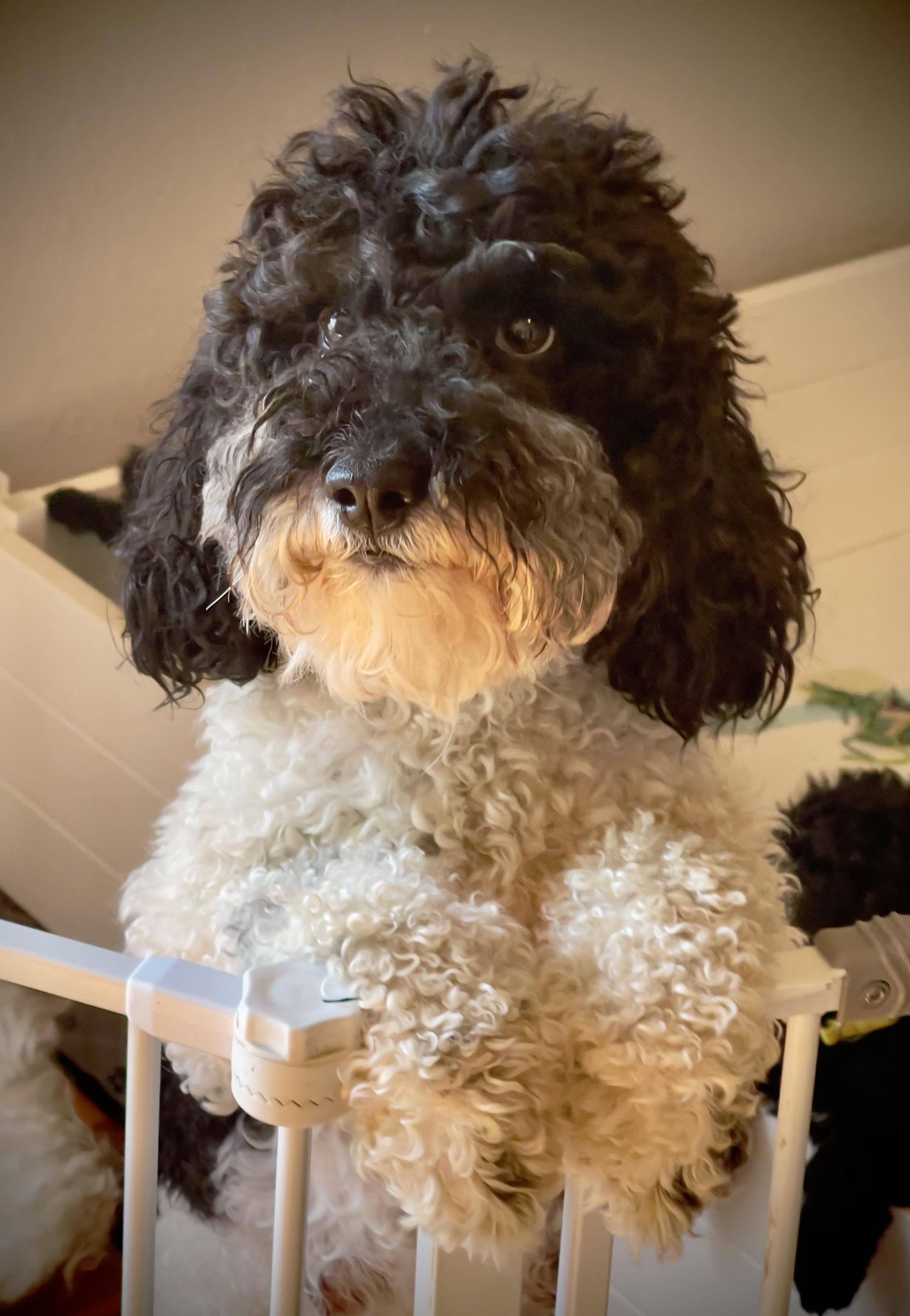 Priscilla is Small Parti Goldendoodle. She smiles when talked or petted. She loves to carry her ball in her mouth and is an excellent mother. She’s very curly.