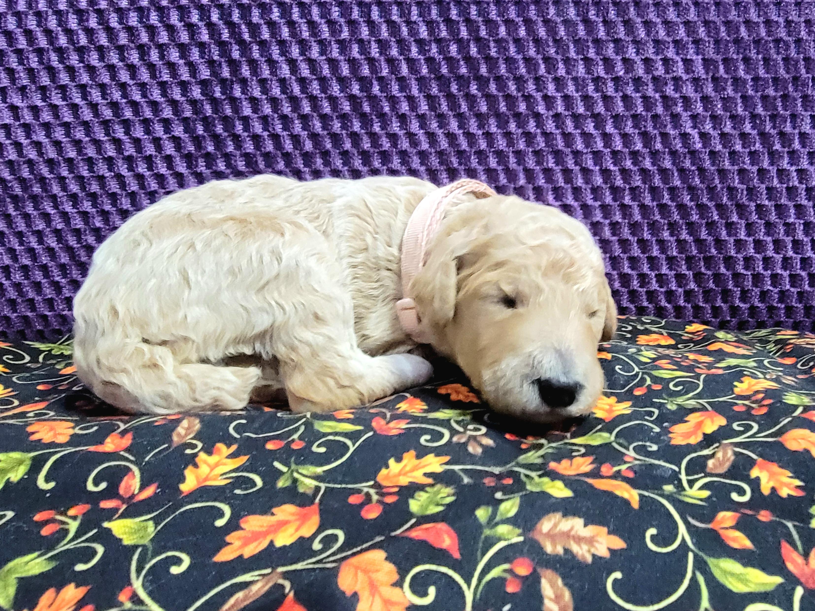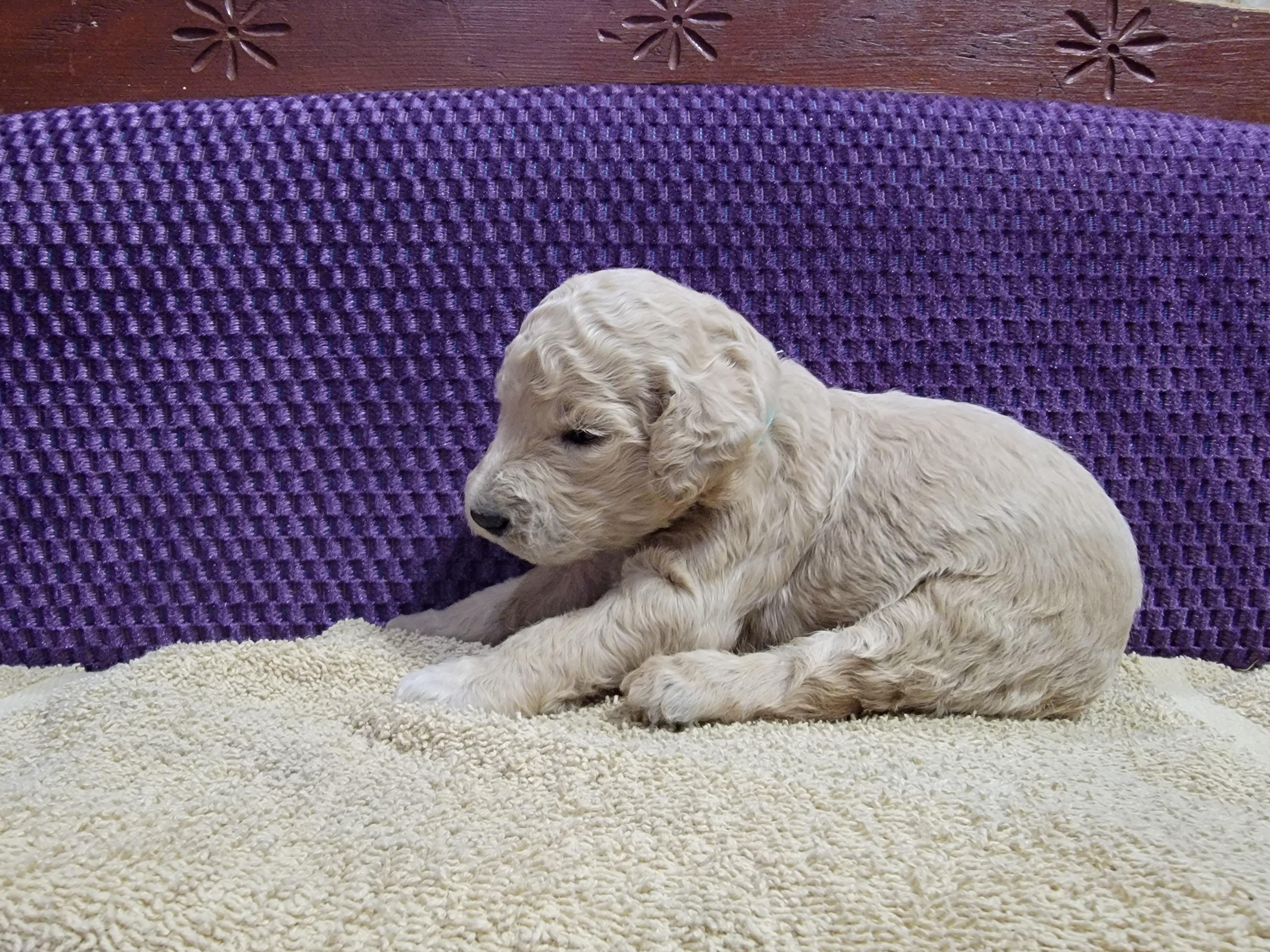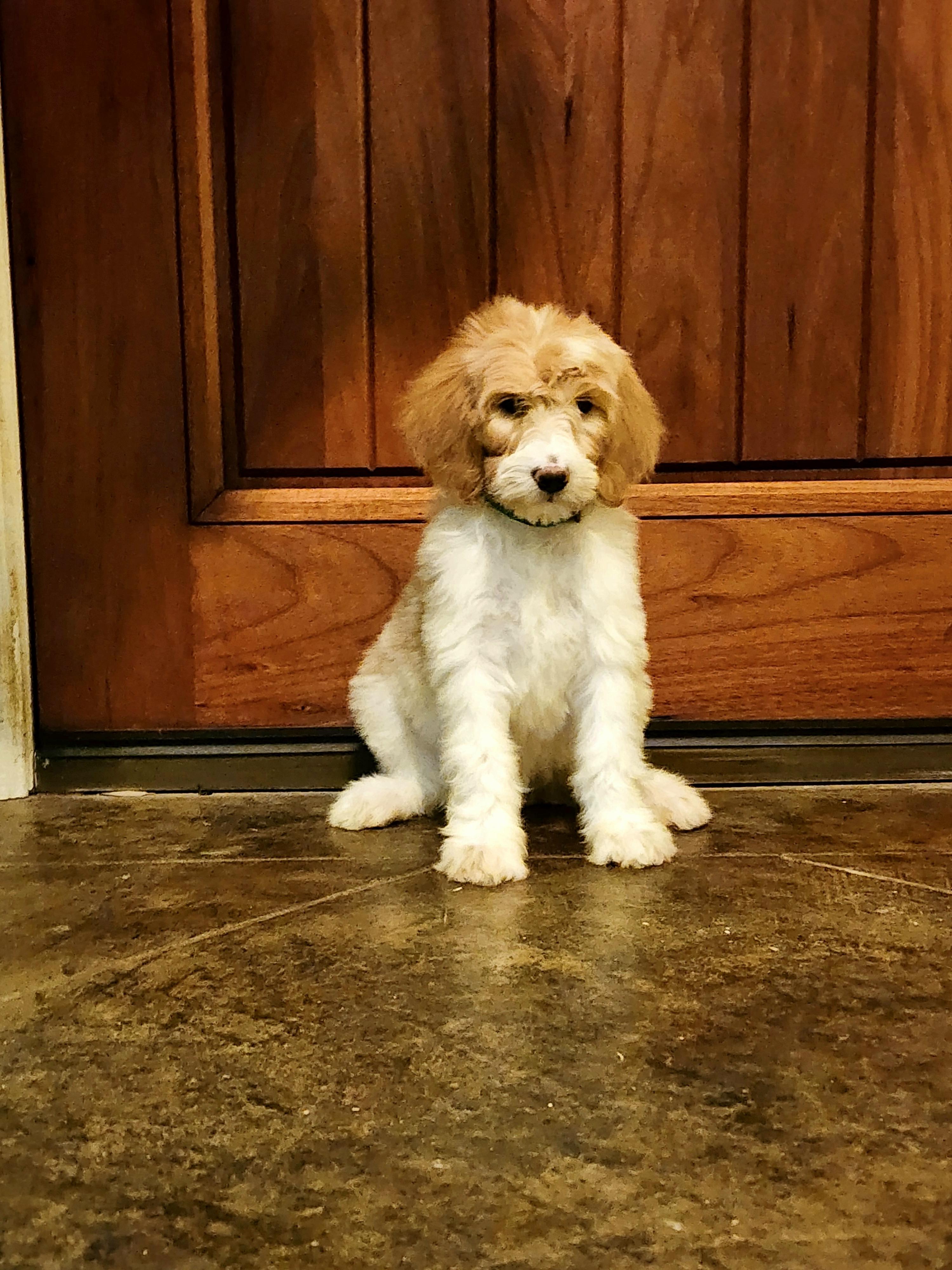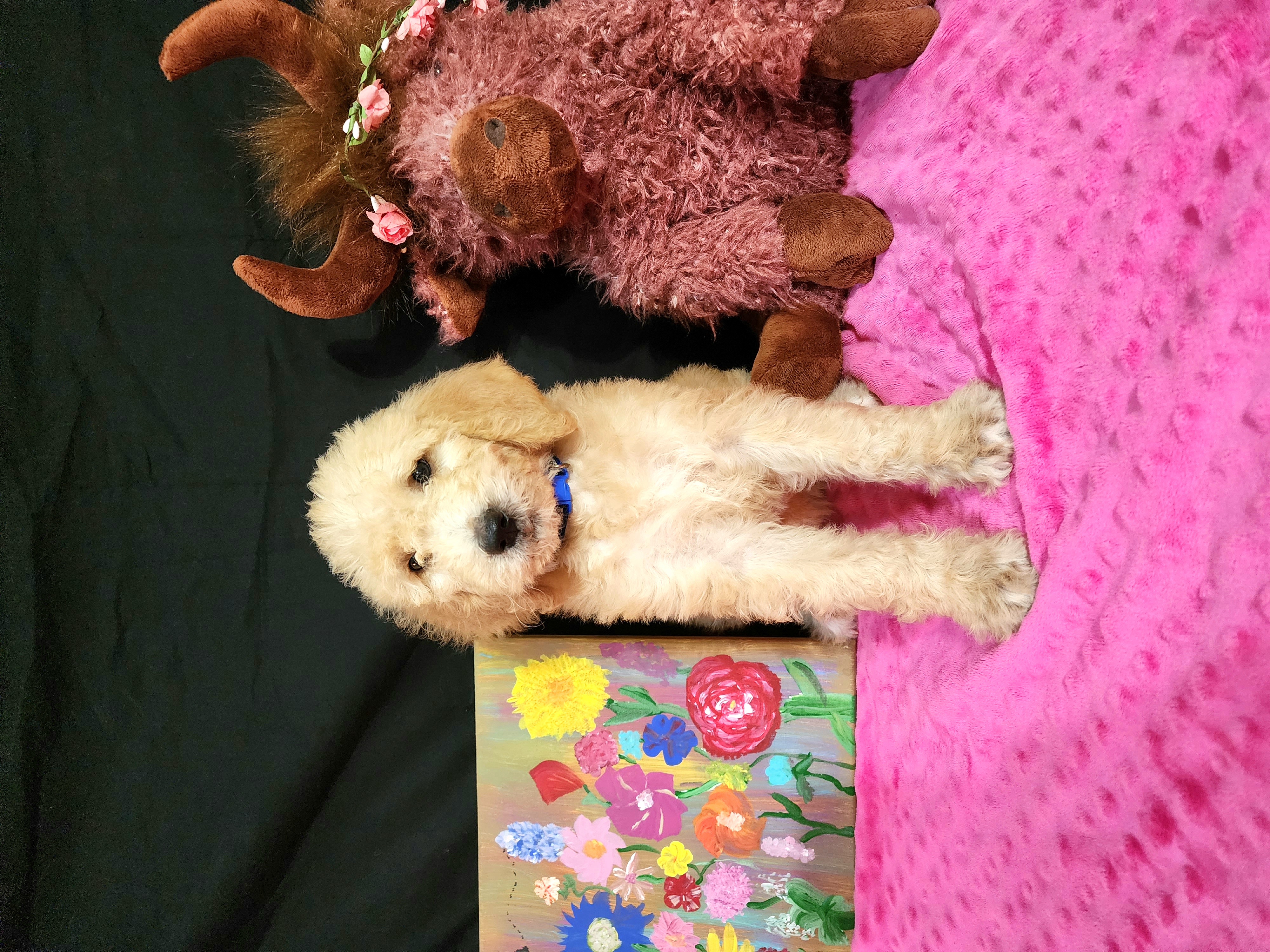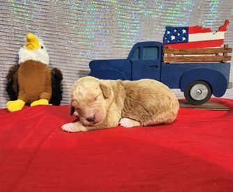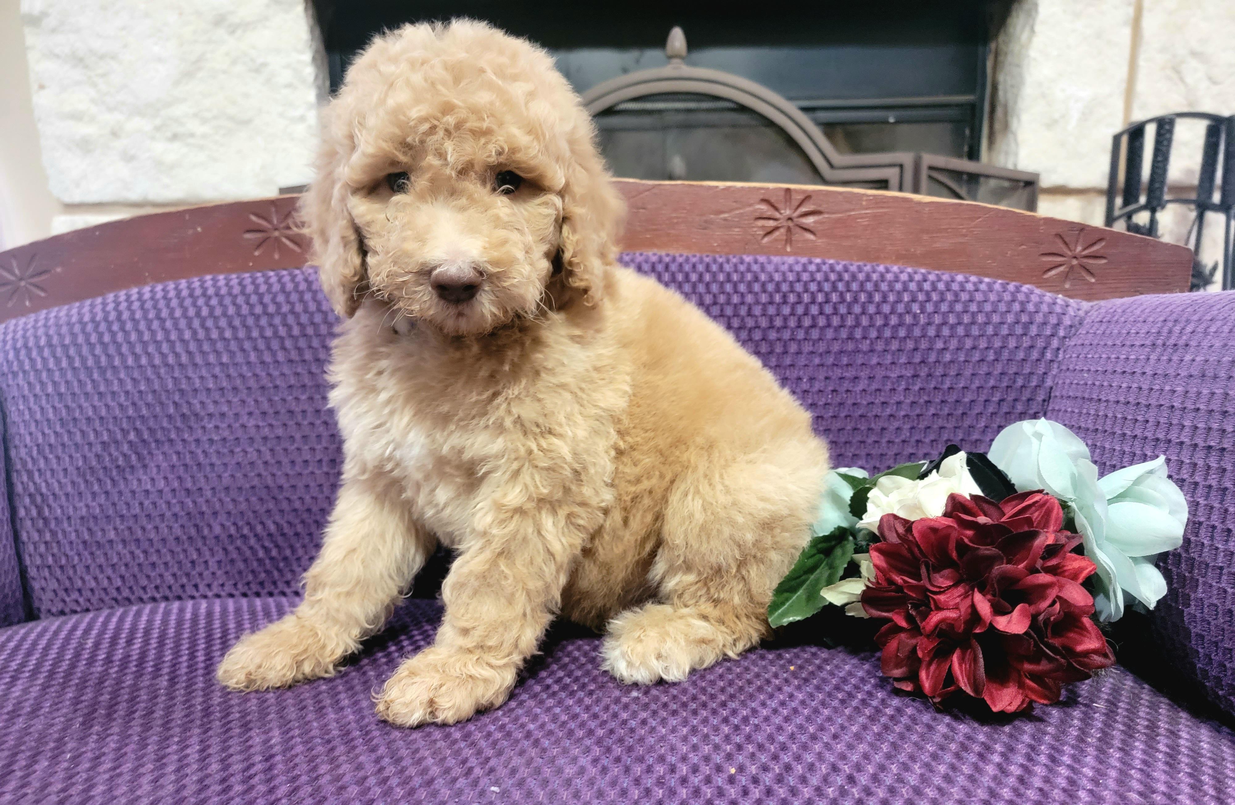 Our Poodle puppies include apricot, cream, and red. Sheepadoodle puppies include blue gray and white and blue and white. Labradoodle puppies include red, apricot, and cream. Colors will vary depending on the parent dogs.