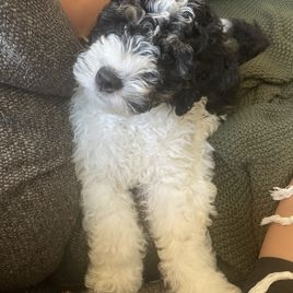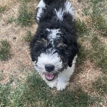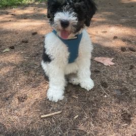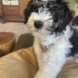 Hi! I'm Charlie. I'm a one year old brown and white F1b Bernedoodle. I'm very friendly and like to steal kisses. I love tummy rubs and playing tug-of-war. I'm a little guy, weighing in at only 16 lbs but I make up for it with my big personality.
