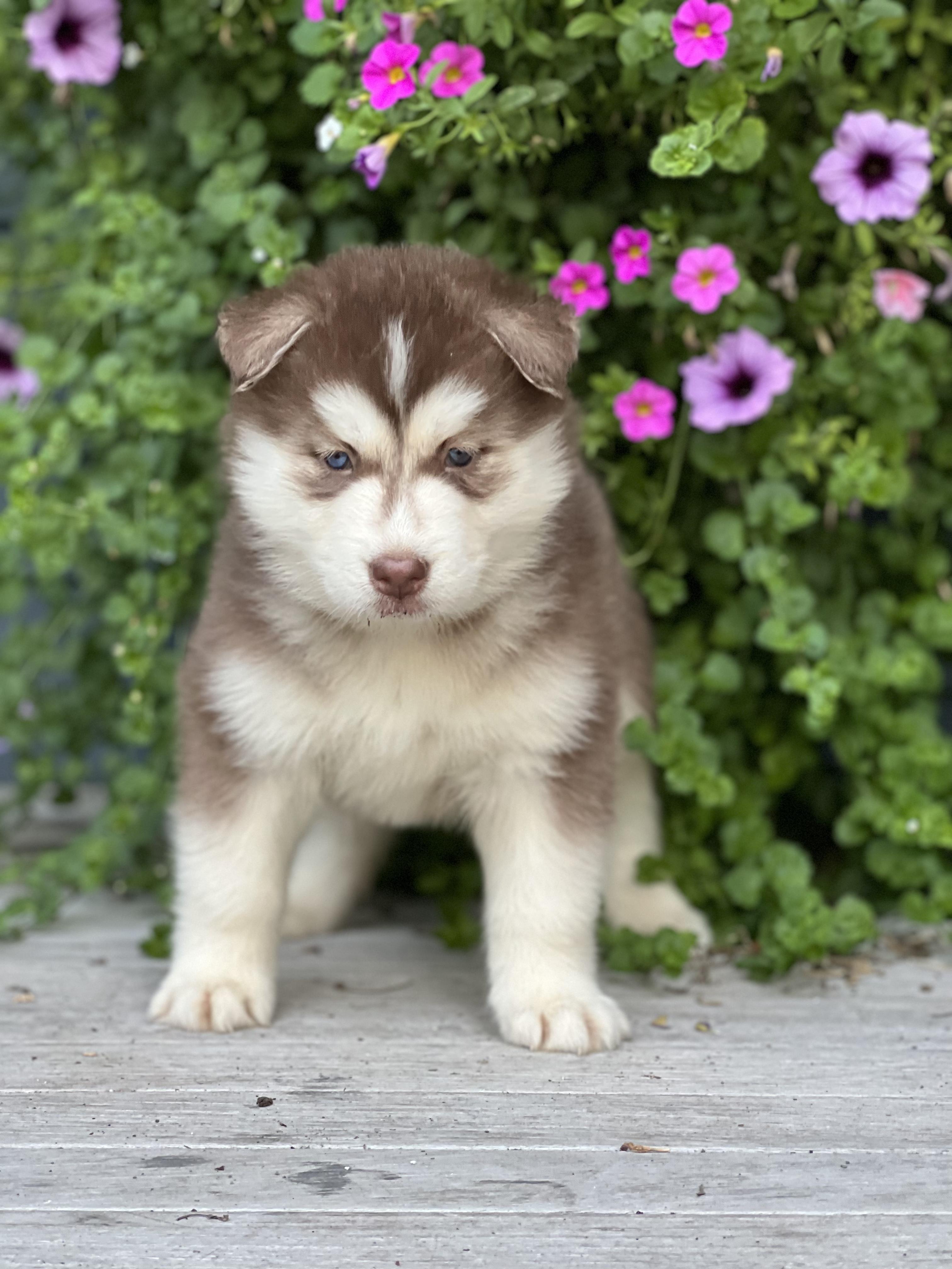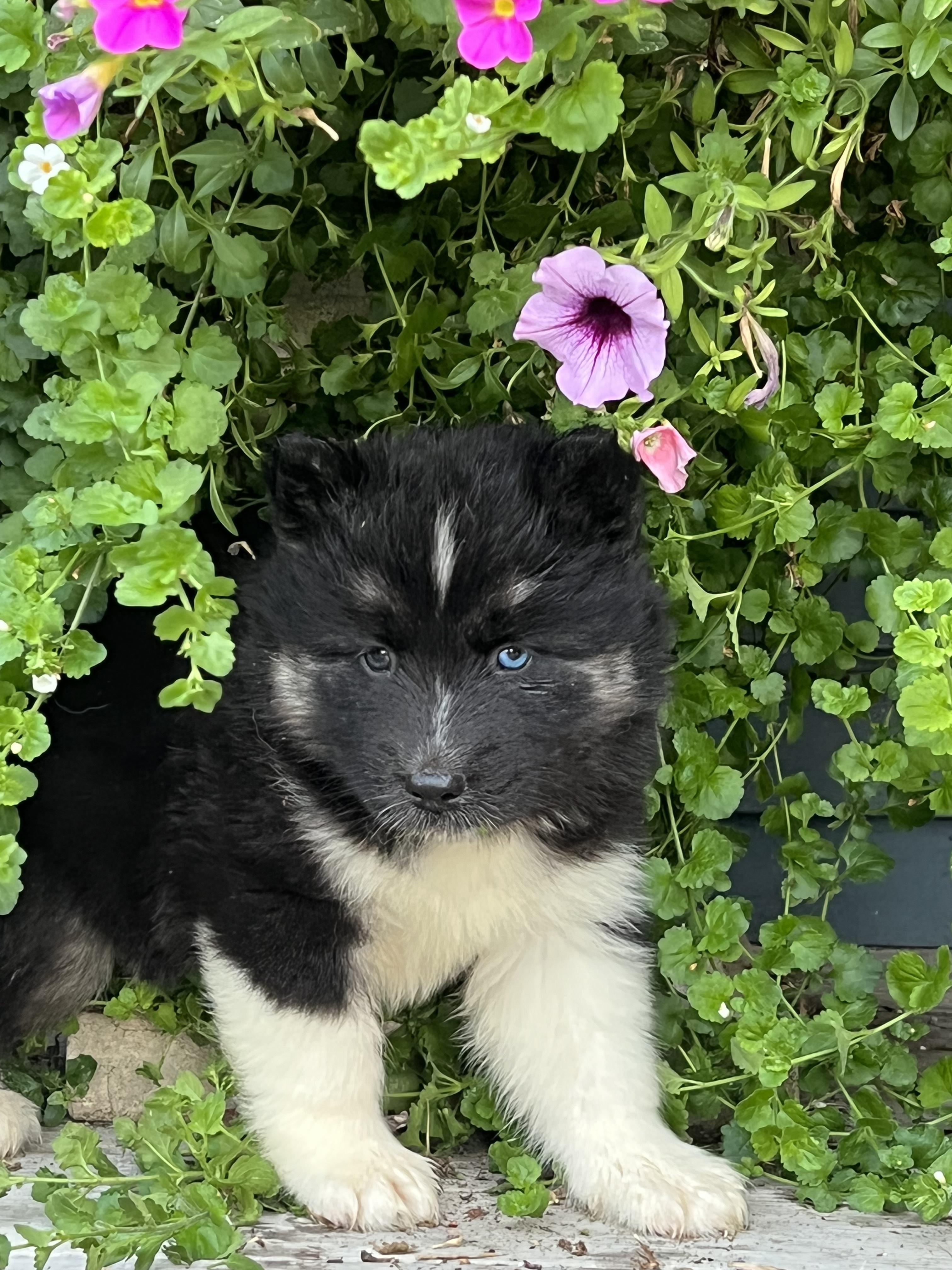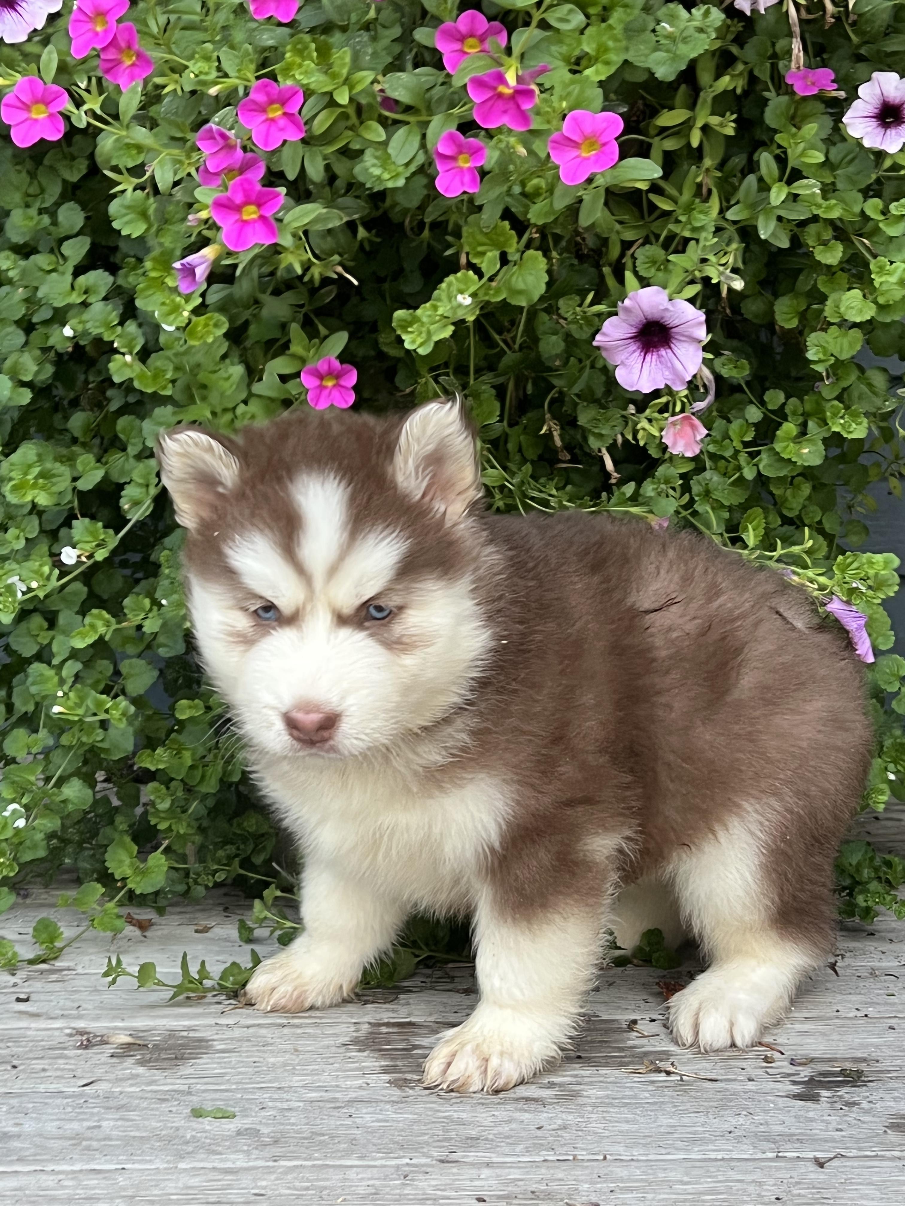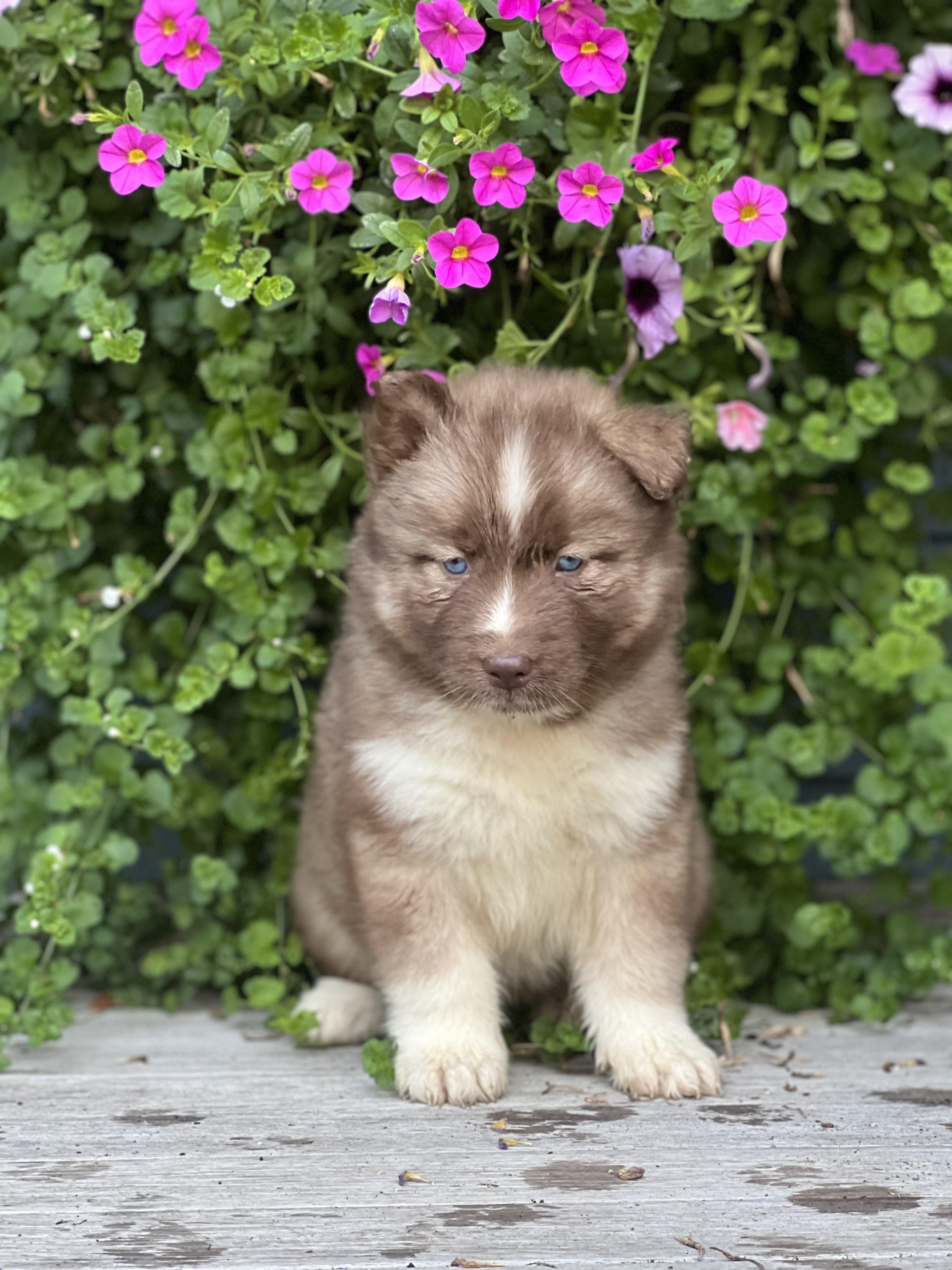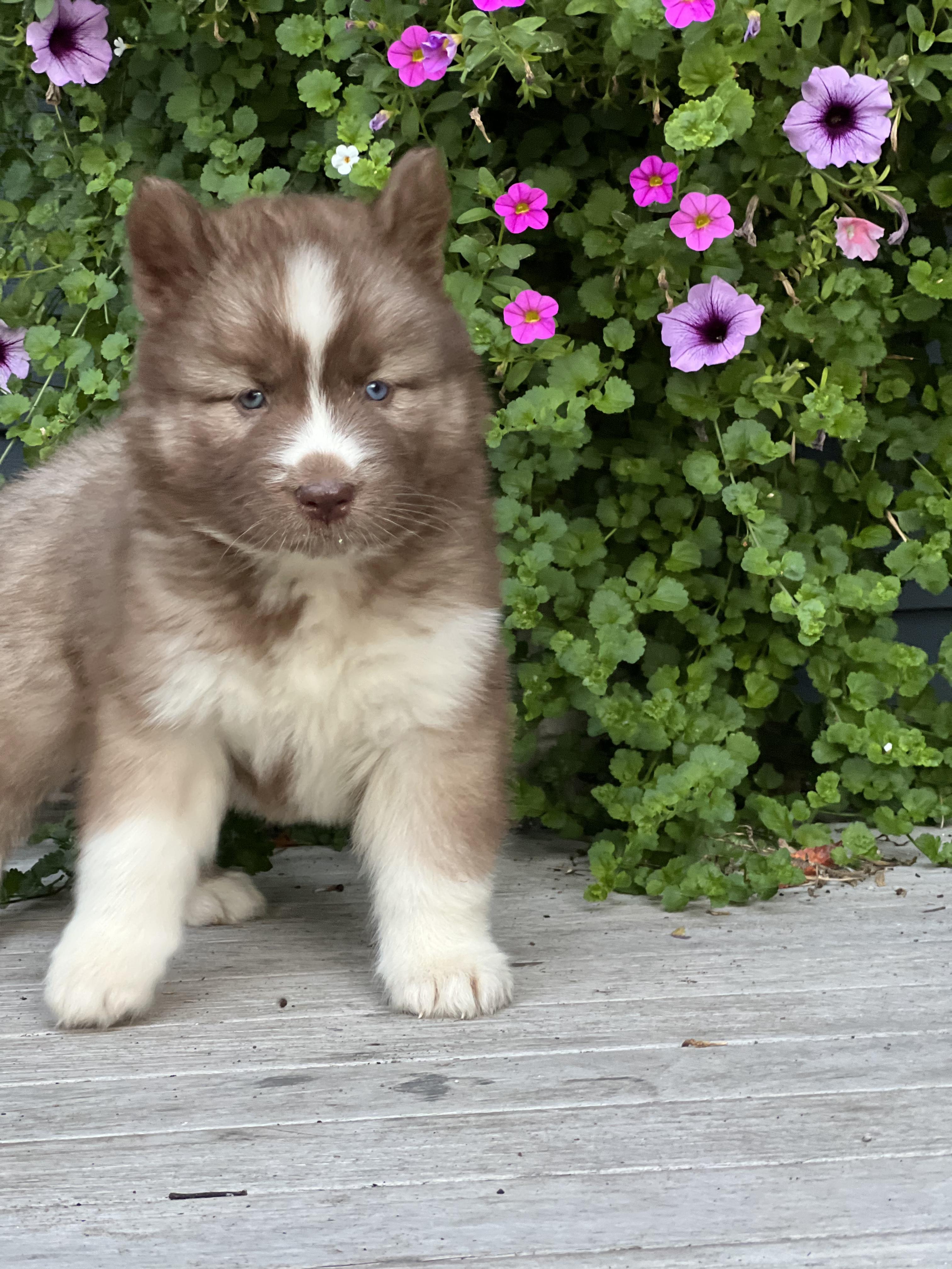 Our Pomsky puppies are blue. Siberian Husky puppies include brown and white, red and white, black tan and white, black and white, and white. Colors will vary depending on the parent dogs.