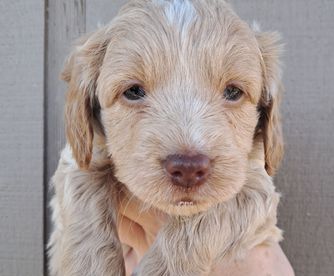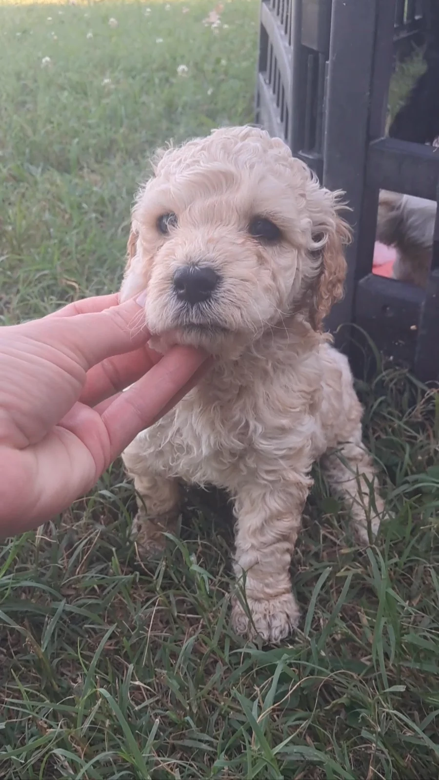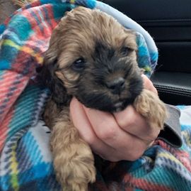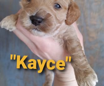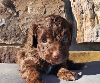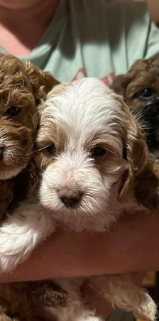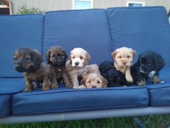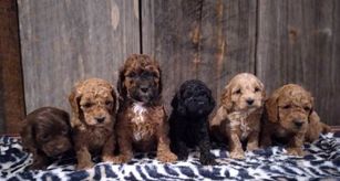 Our Cockapoo puppies include brown, black and white, black, golden, buff and white, buff, and brown and white. Aussiedoodle puppies include brown and white and apricot. Colors will vary depending on the parent dogs.