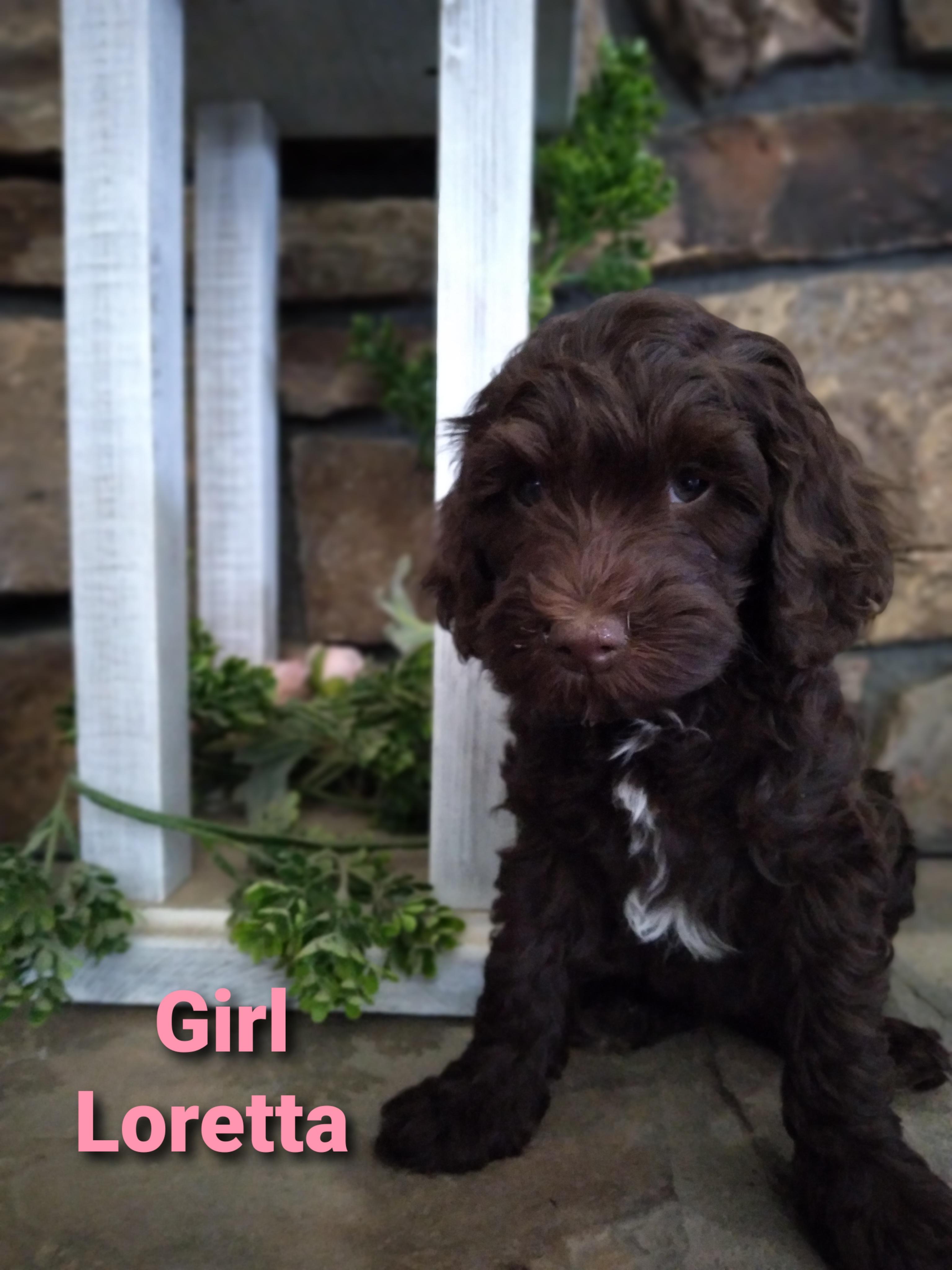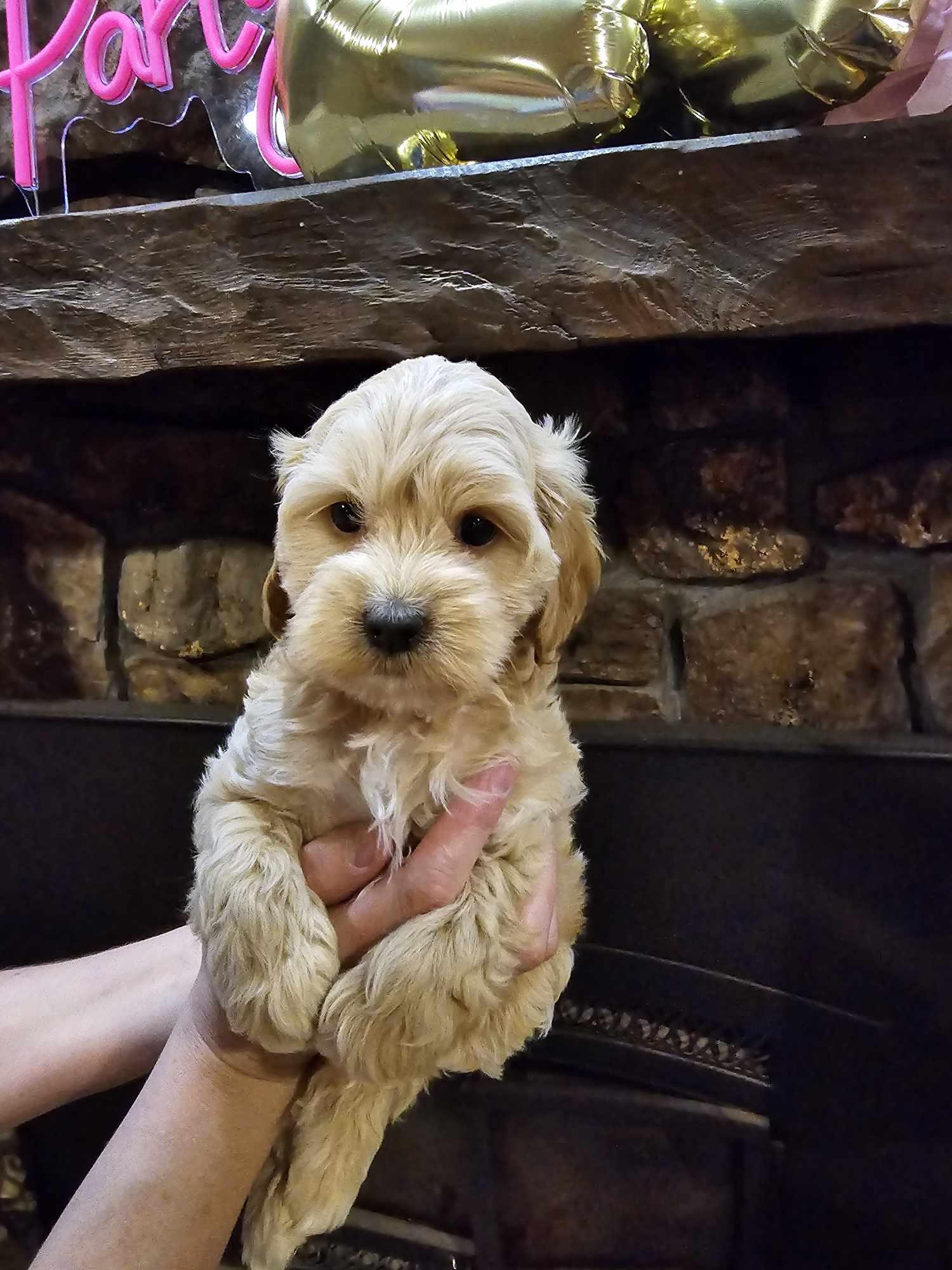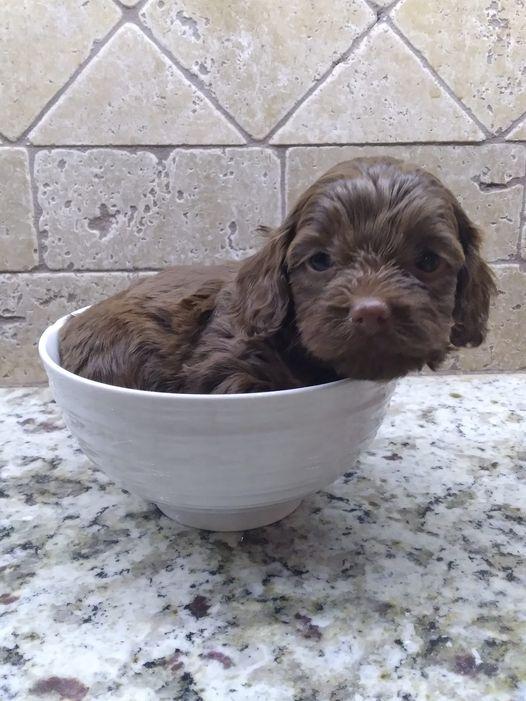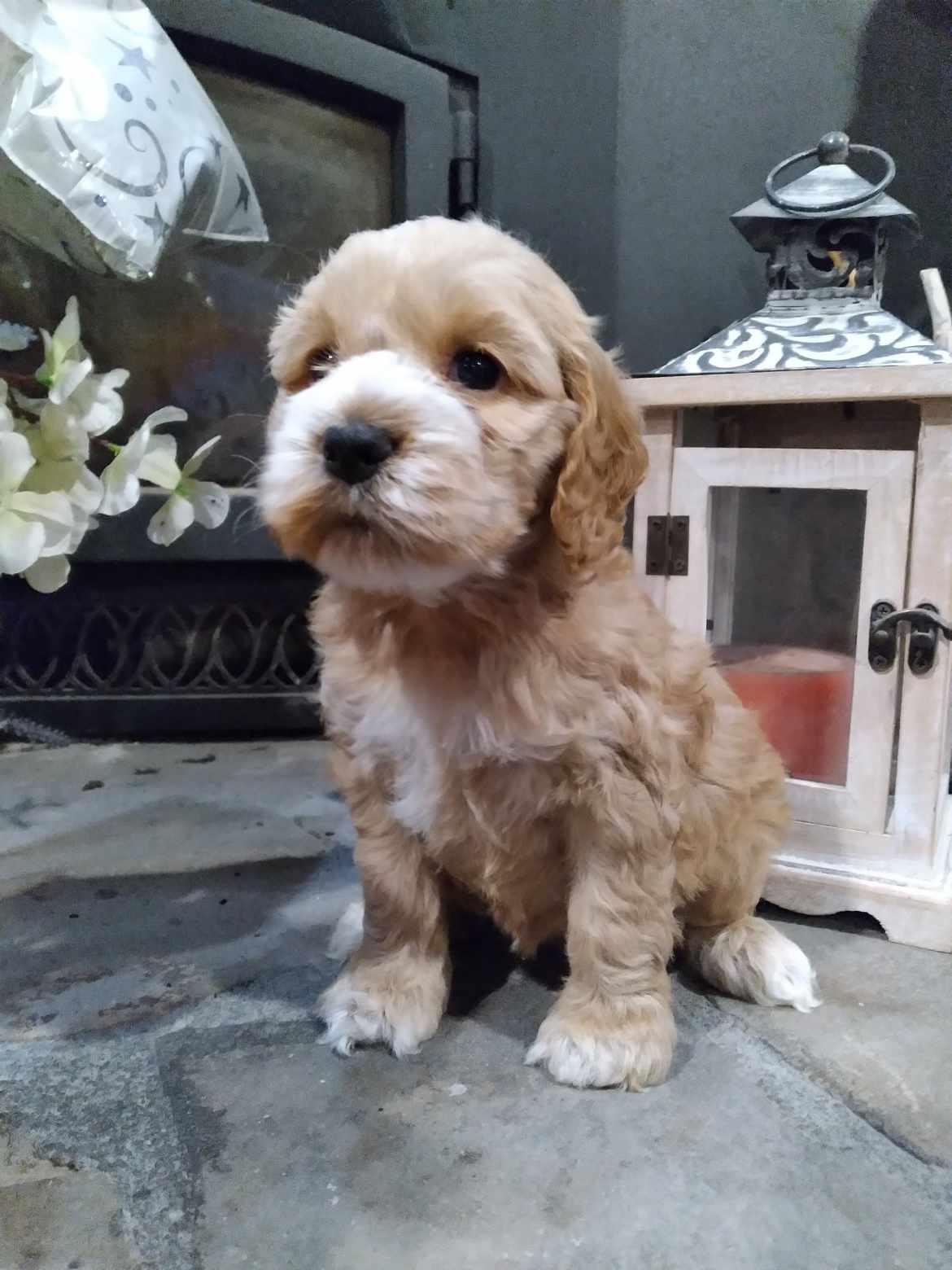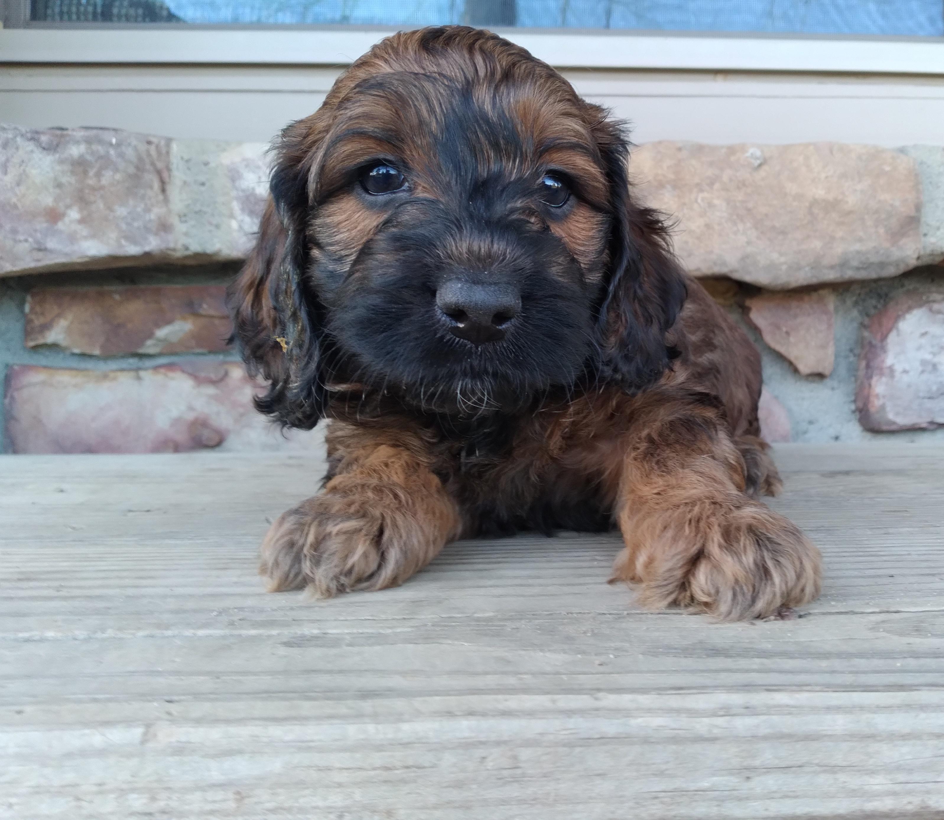 Our Aussiedoodle puppies include brown and white and apricot. Cockapoo puppies include brown, black and white, black, golden, buff and white, buff, and brown and white. Colors will vary depending on the parent dogs.