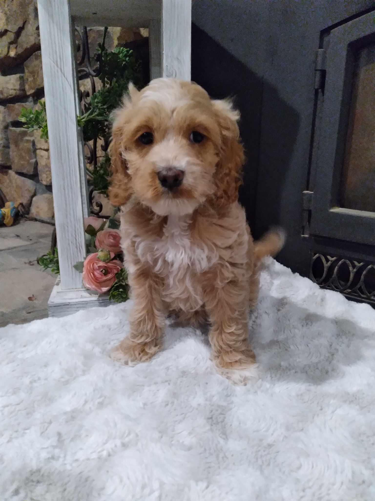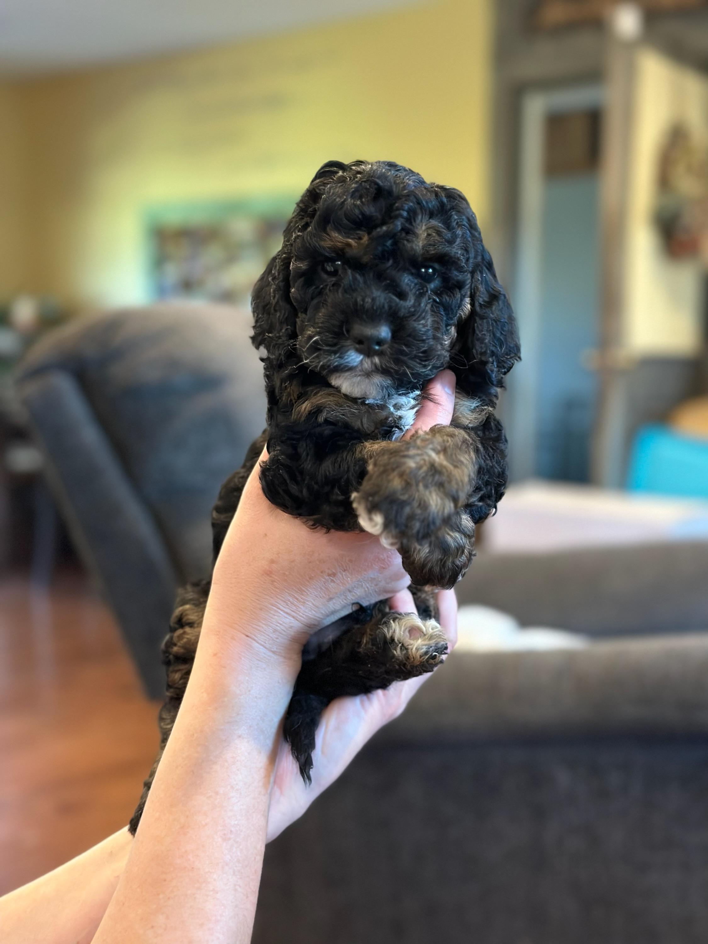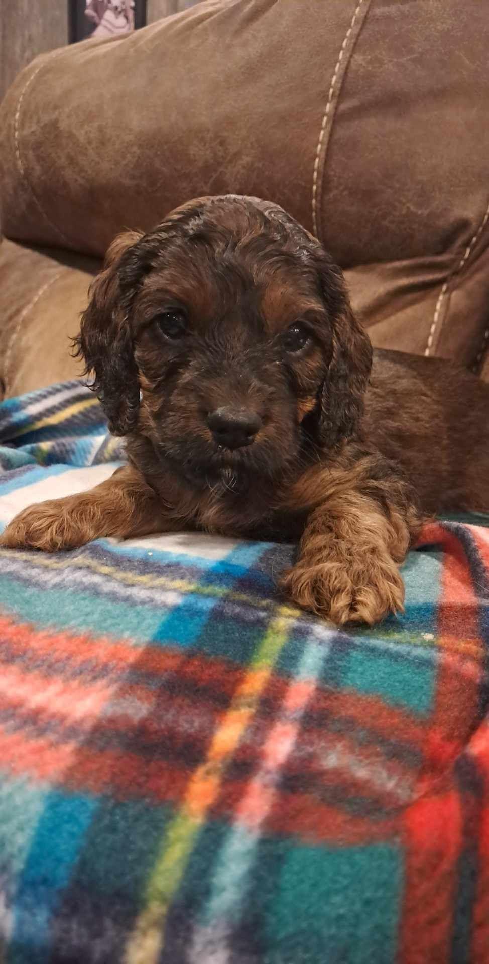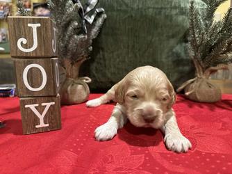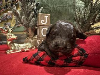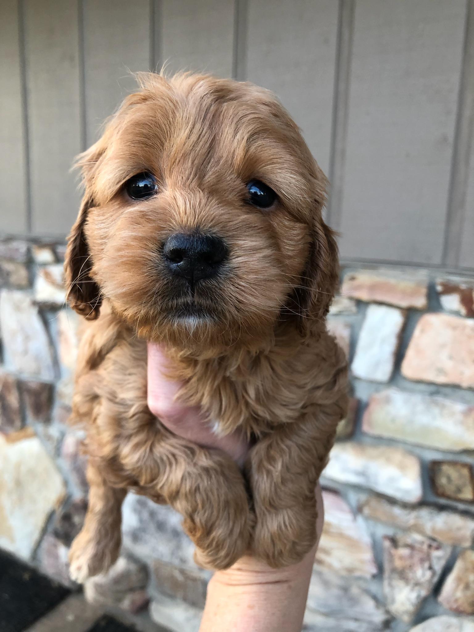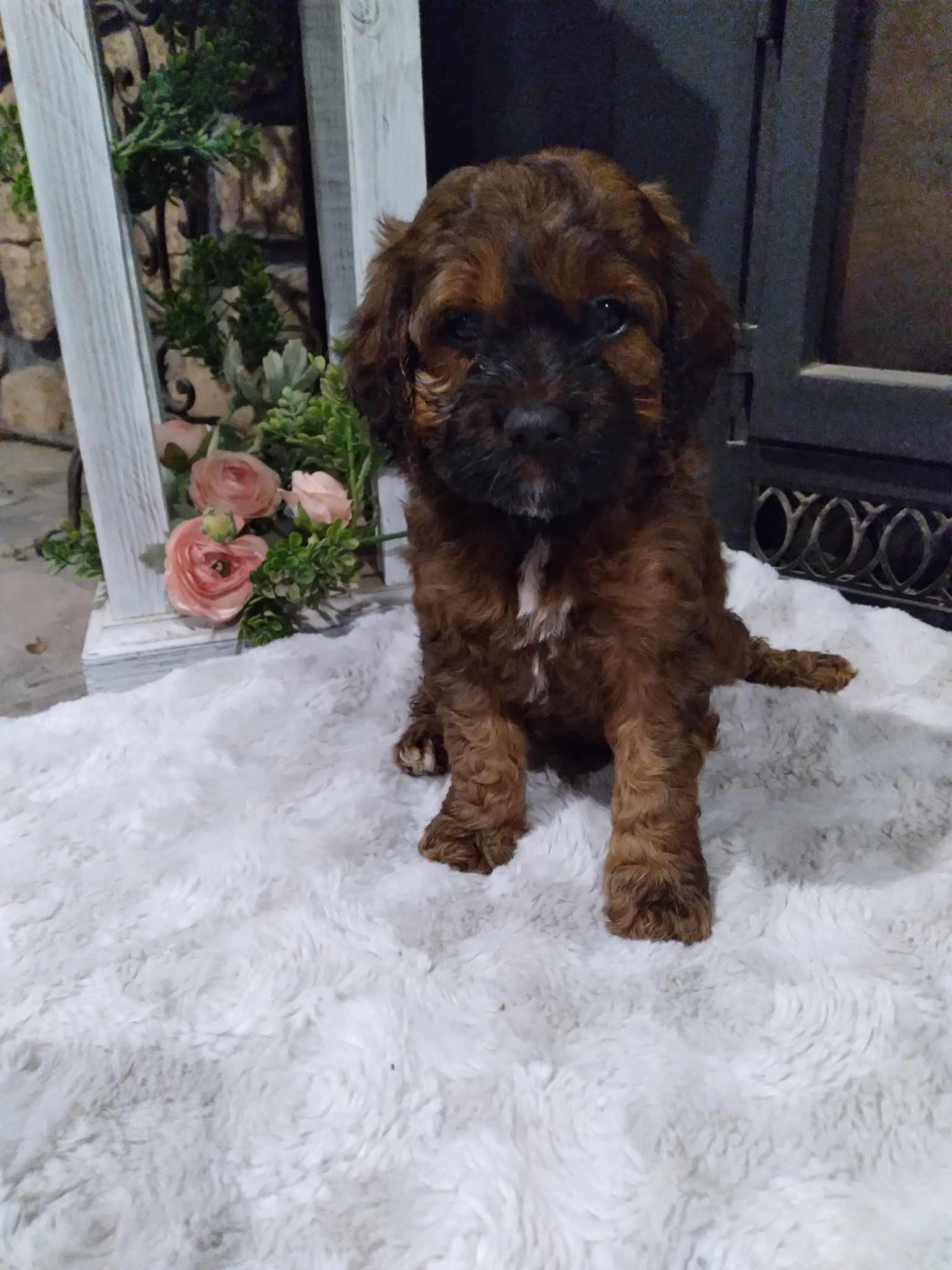 Our Aussiedoodle puppies include brown and white and apricot. Cockapoo puppies include brown, black and white, black, golden, buff and white, buff, and brown and white. Colors will vary depending on the parent dogs.