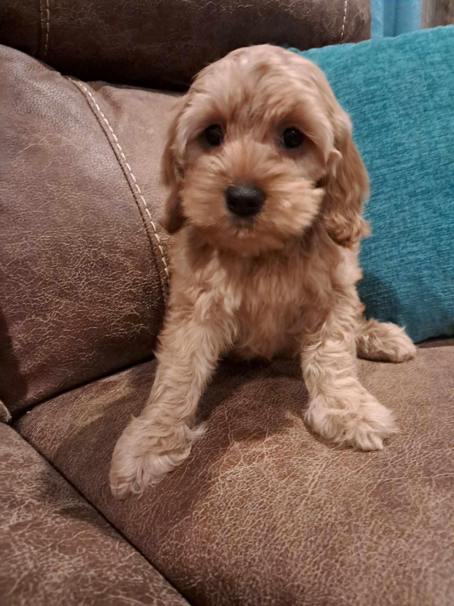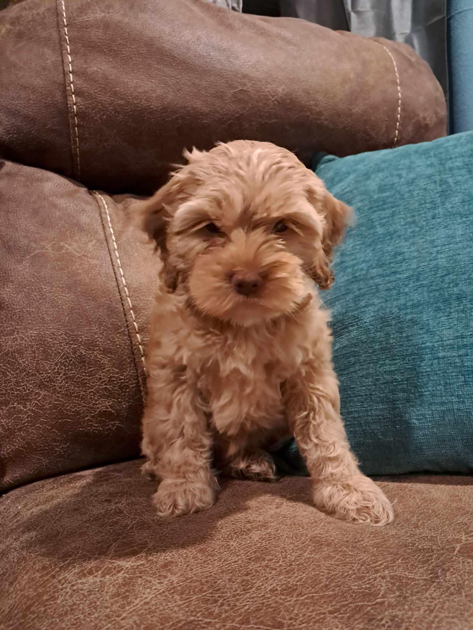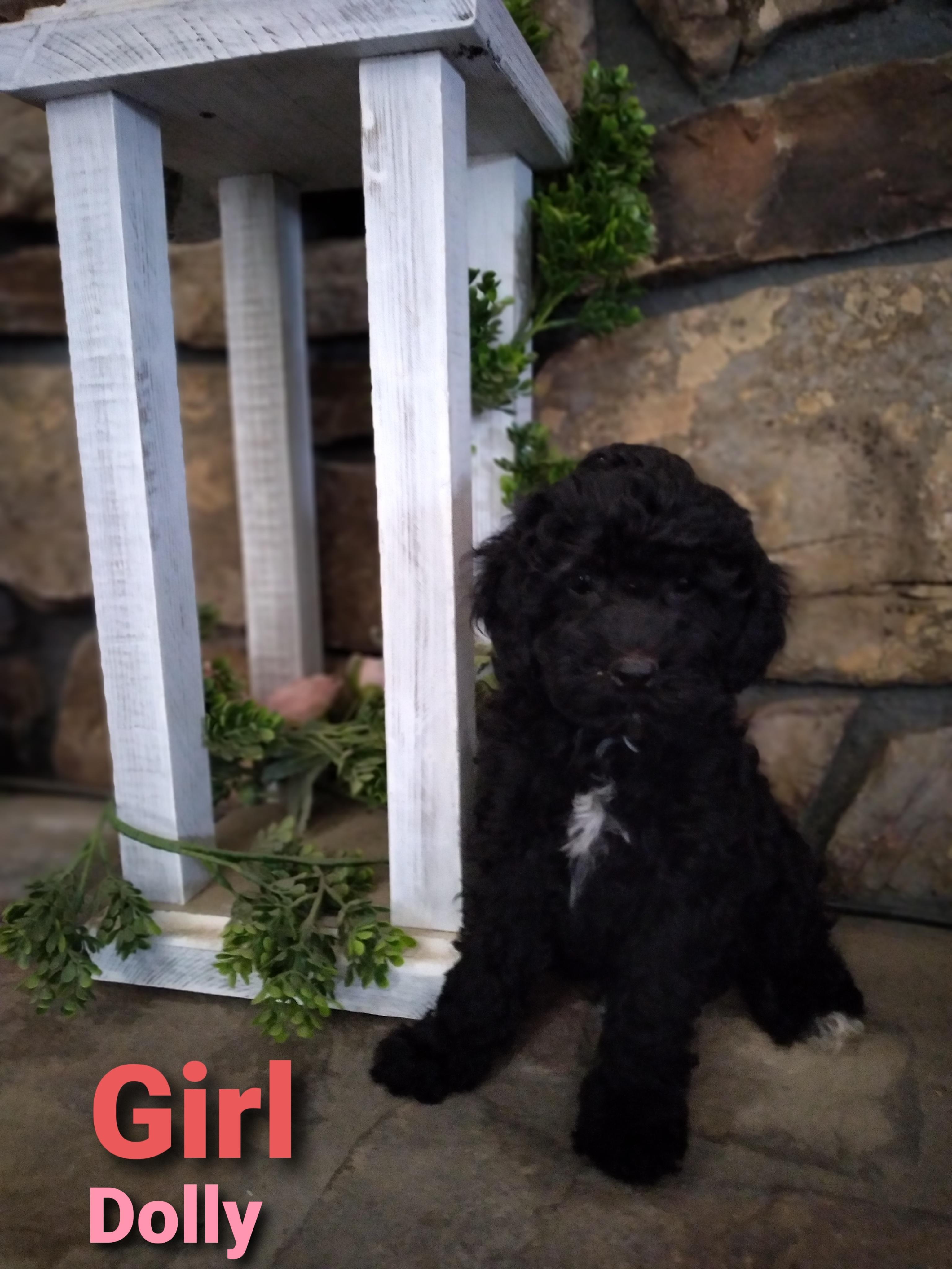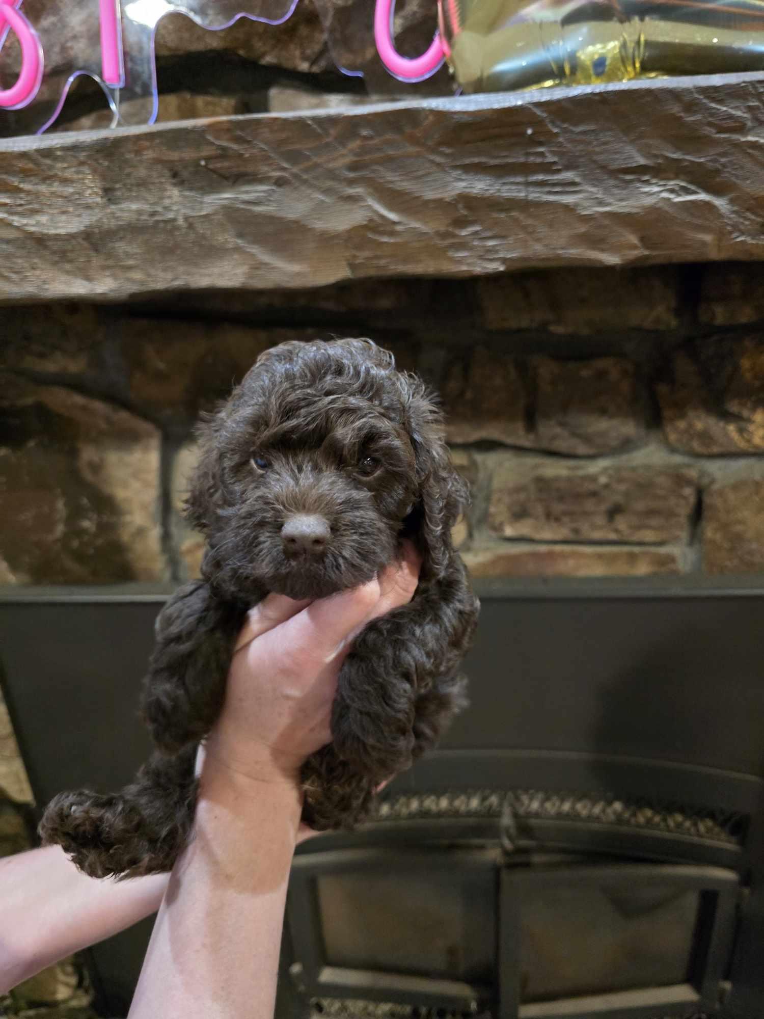 Our Aussiedoodle puppies include brown and white and apricot. Cockapoo puppies include brown, black and white, black, golden, buff and white, buff, and brown and white. Colors will vary depending on the parent dogs.