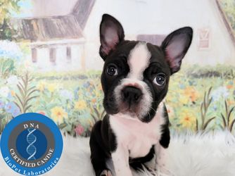 Our Boston's are pets and live with us. We DNA test all adults & DNA certify parentage of our puppies through BioPet Labs. All pups are members of the DNA World Pet Registry. We feed high quality food, give NuVet/NuJoint supplements, have a 1 year health guarantee. We give Simparica trio 1x a month, & pups are vet checked. Puppy kit includes Wellness Complete puppy food, toy, blanket, collar.