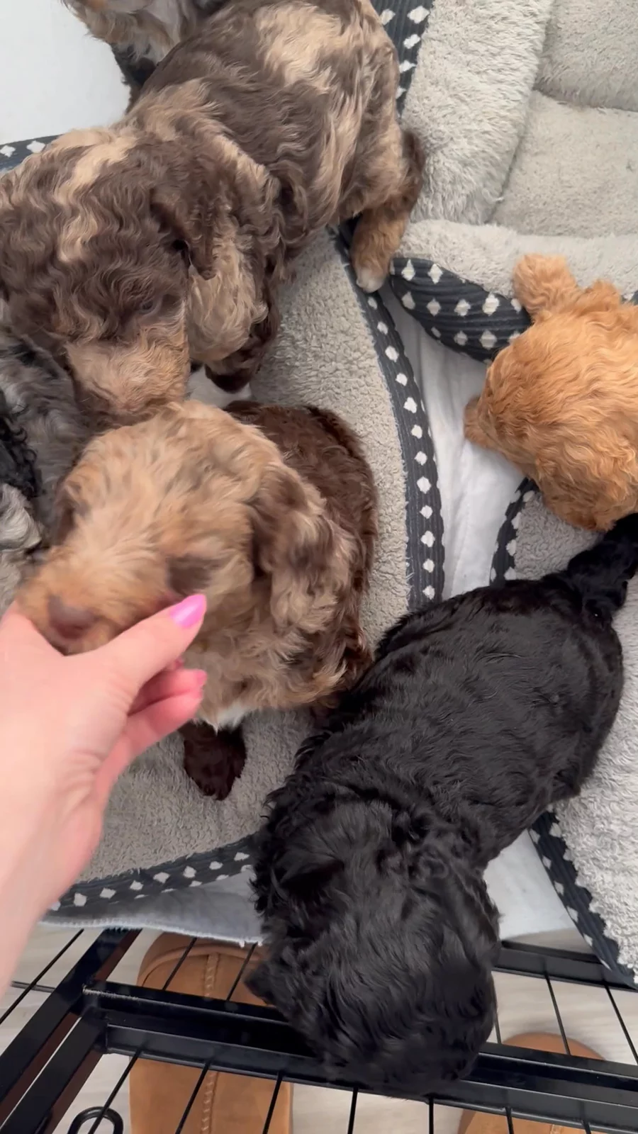 5 weeks old and growing like weeds! These babies are doing SO good! They are currently working on manding/manners, going potty on the grate, and eating soaked kibble.