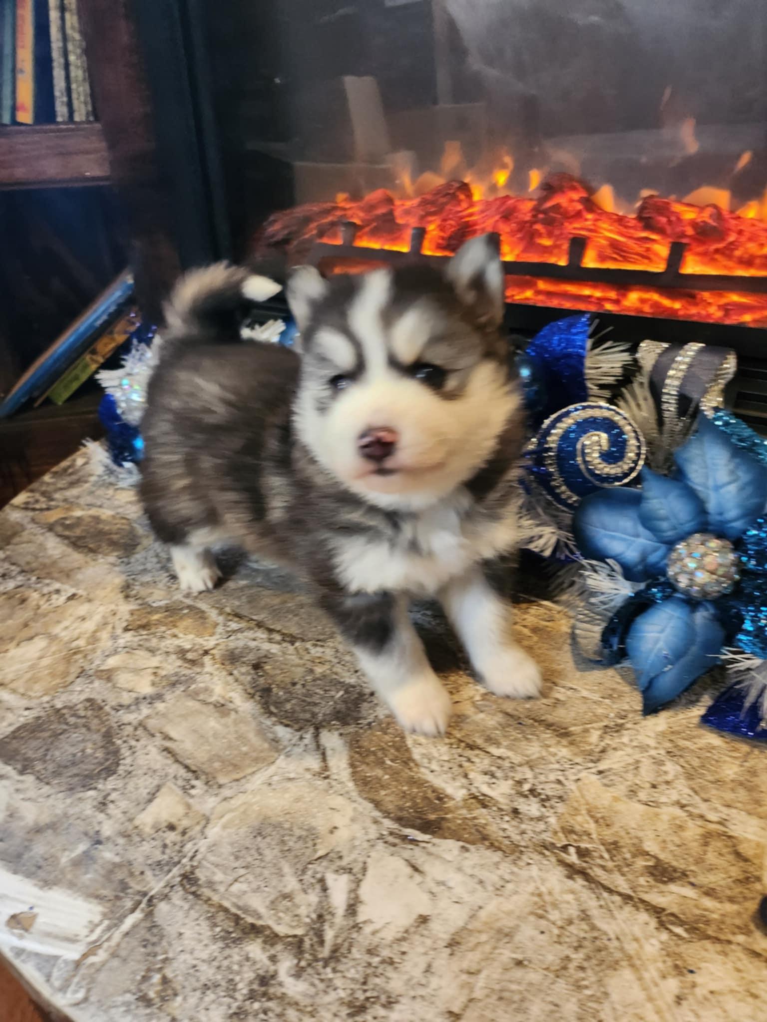 Baby is a beautiful, sweet second-generation, Pomsky. She is black and white with ice blue eye. She just loves people is a wonderful mommy!!